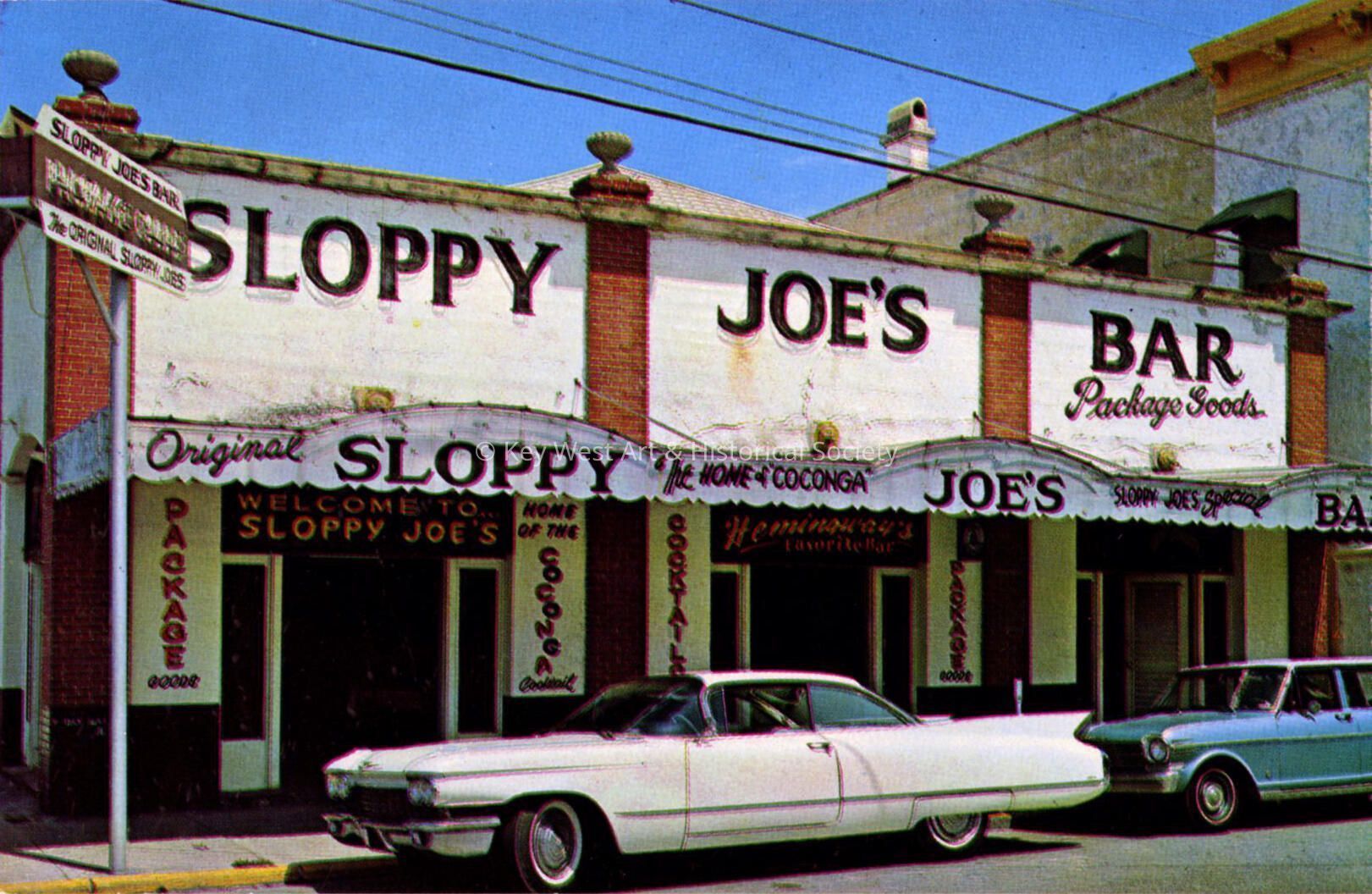 Postcard depicting Sloppy Joe's Bar at 201 Duval Street. Notation on verso, 'Sloppy Joe's Bar...This nationally renowned landmark has been located on the corner of Greene and Duval Streets in Old Town Key West for over 45 years. Ernest Hemingway and Josie 'Sloppy Joe' Russell spent numerous hours in the bar doing 'research' for some of 'Papas' most famous novels. Russell, the original owner of Sloppy Joe's, was immortalized as the protagonist Harry Morgan in Hemingway's classic, To Have and Have Not.'Subject Place