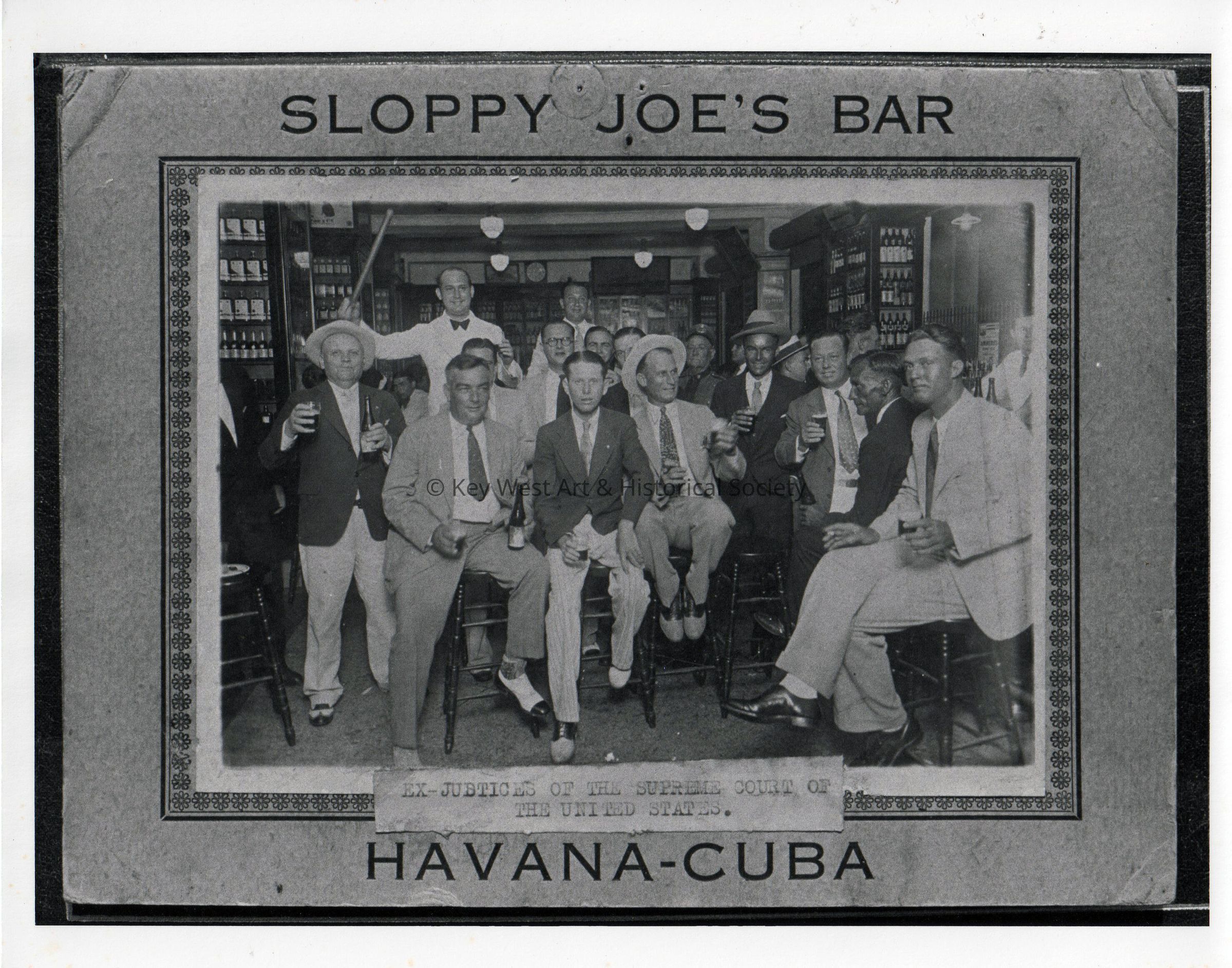 Black and white photograph of unknown men at Sloppy Joe's Bar in Havana, Cuba. Typed caption reads, 'Ex-Justices of the Supreme Court of the United States.'