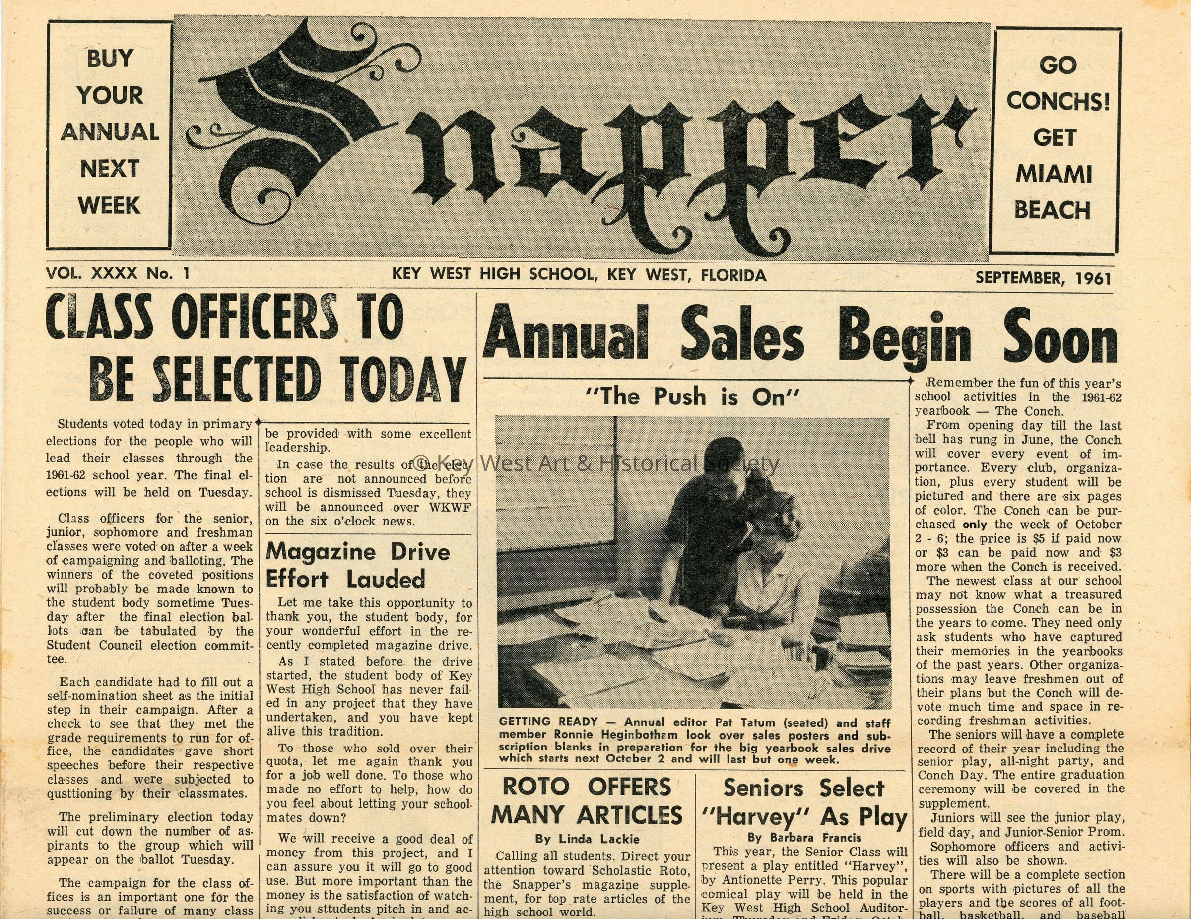 September 1961 edition of Key West High School's student newspaper Snapper containing six pages.