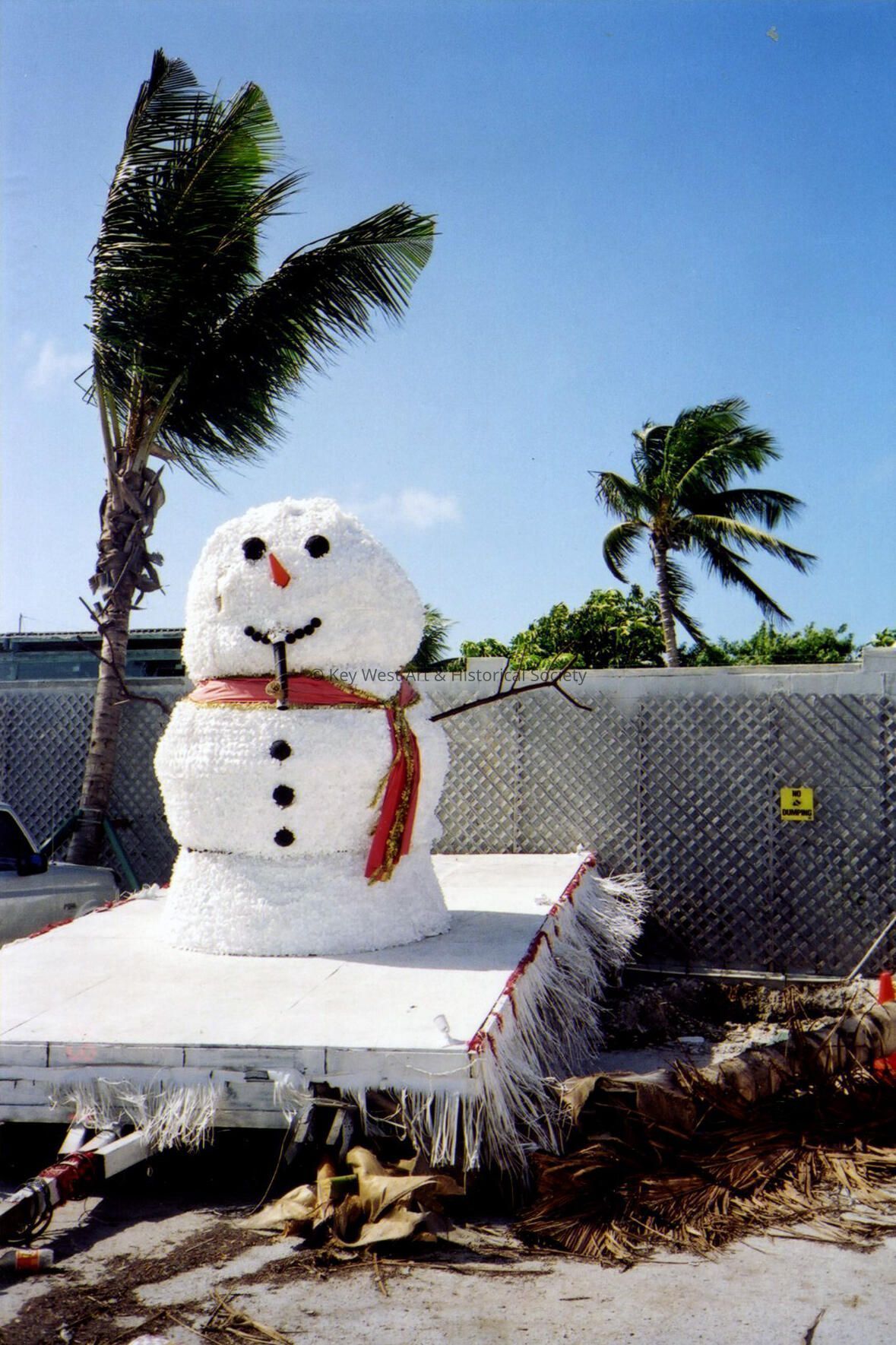 Color photograph taken by historian James M. Goode of a snowman float near the Southernmost Point during a trip to Key West in Feburary 2001. Printed from Roll 1.Collection