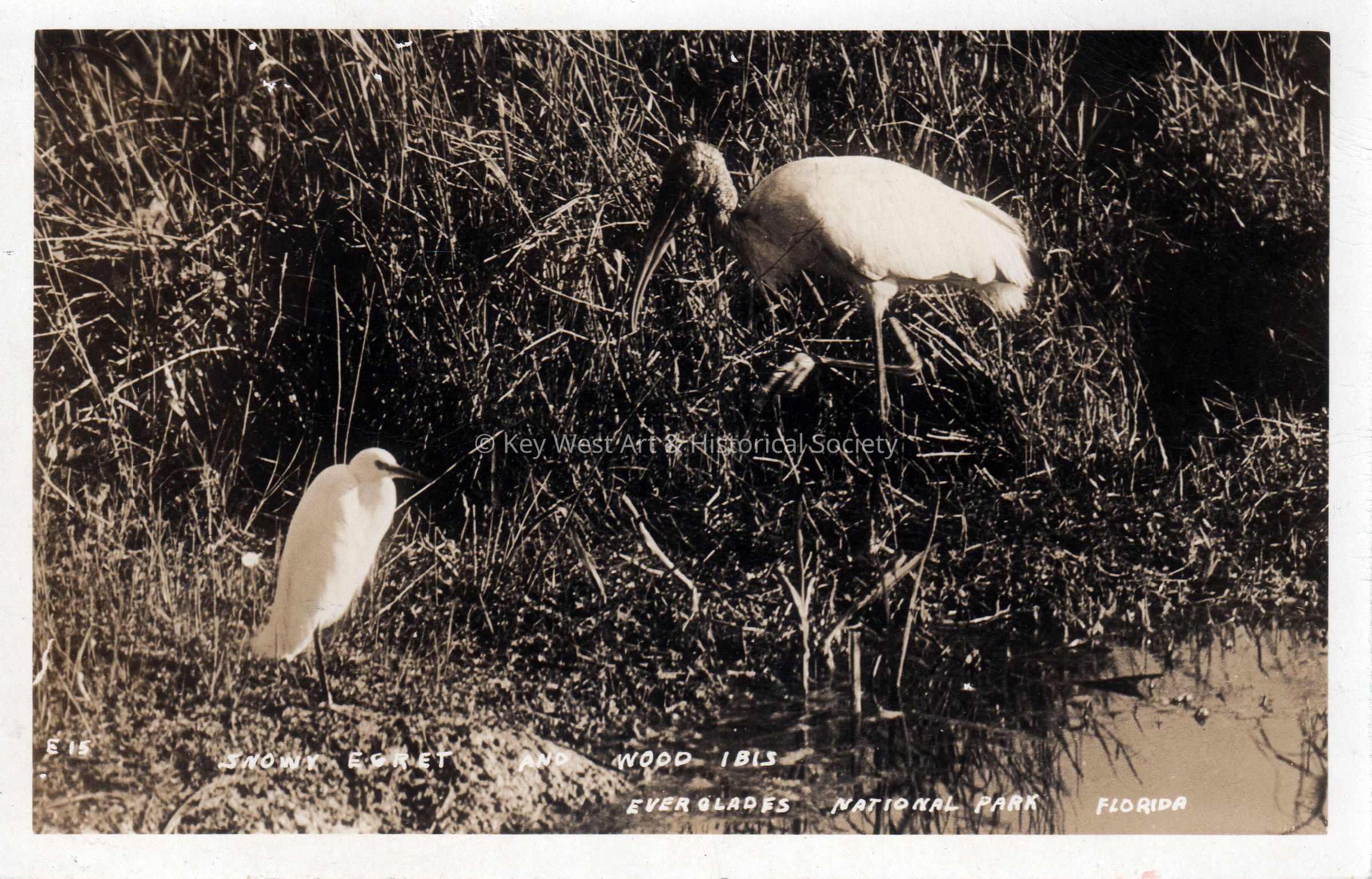 Postcard depicting two shore birds. The caption reads, ‘Snowy Egret and Wood Ibis, Everglades National Park, Florida.’Collection