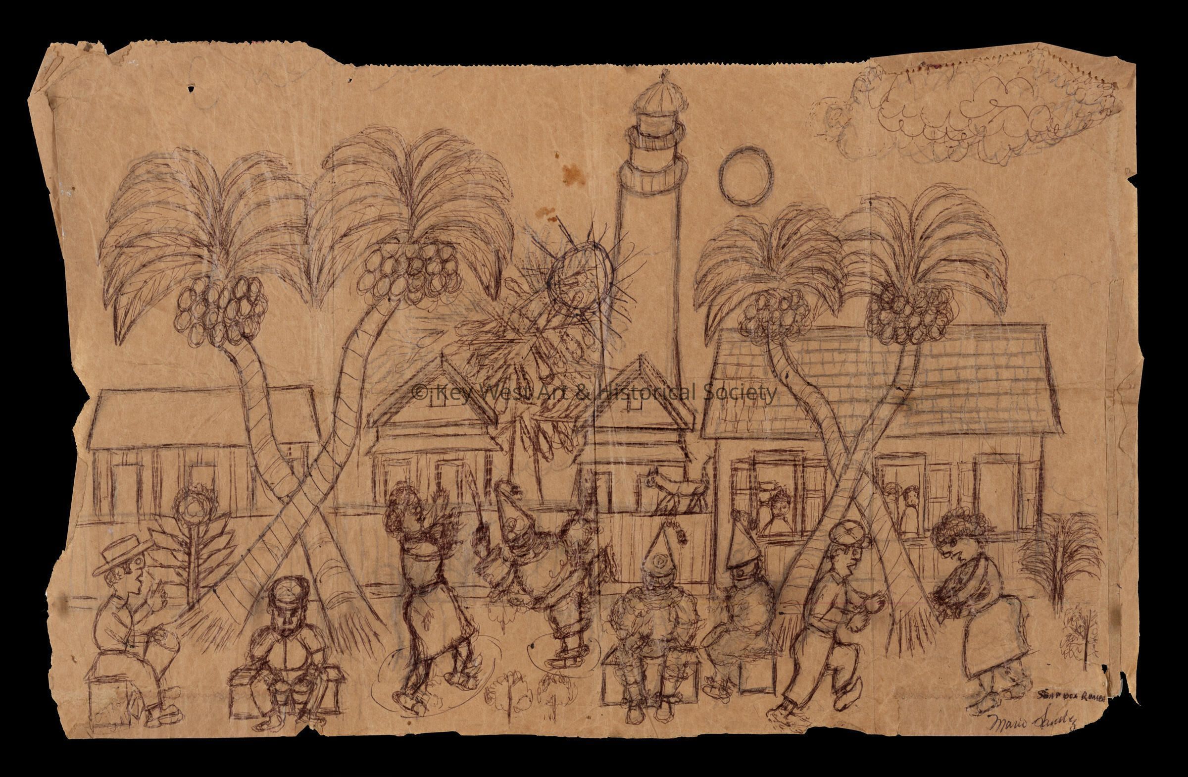 Pencil sketch on an unfolded paper bag by Mario Sanchez depicting a group of people, some in costume, dancing with the Key West Lighthouse in the background.Type of Drawing