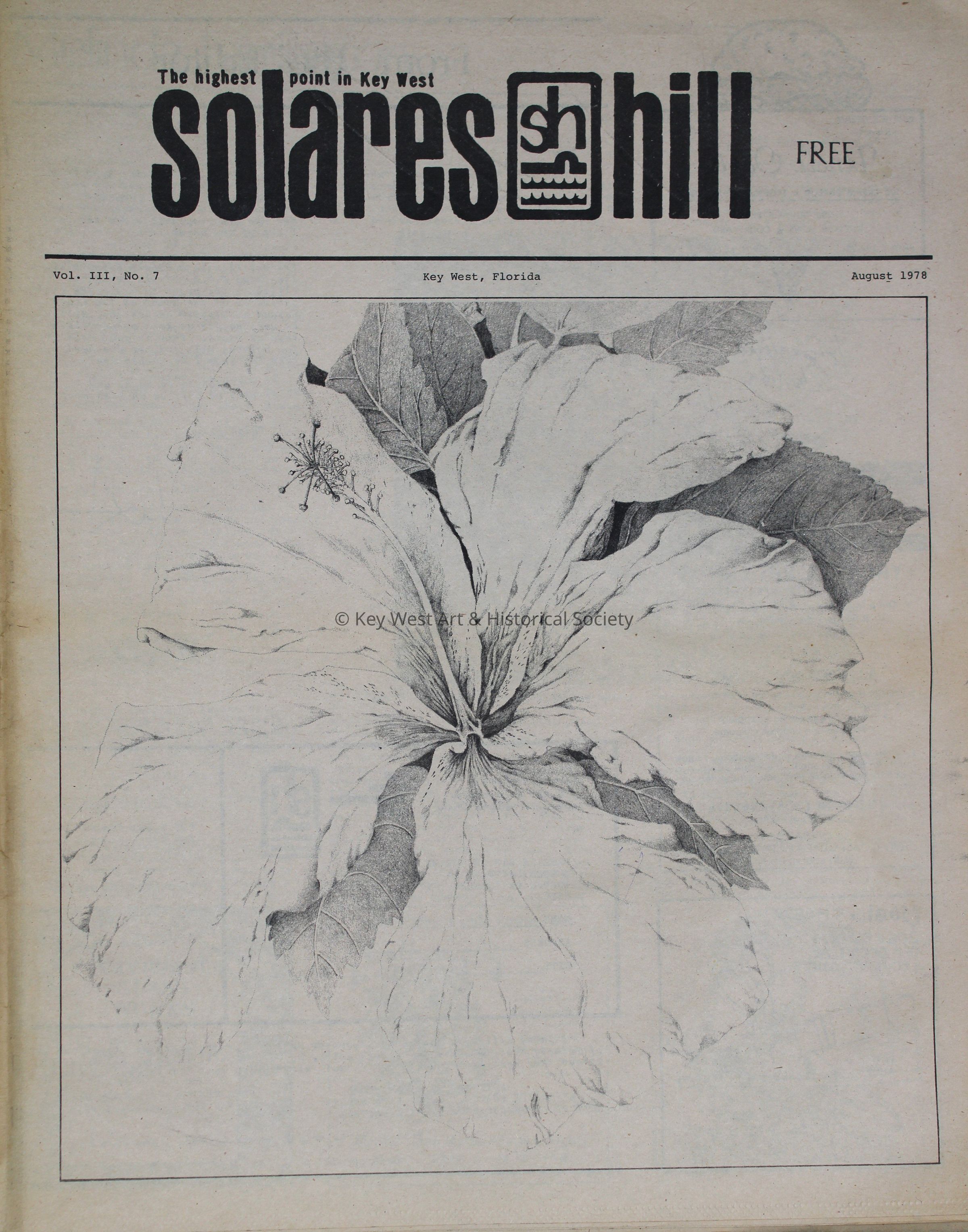 The August 1978 edition of the newspaper Solares Hill containing twenty-eight pages. Front page artwork by Scotty Hillman.