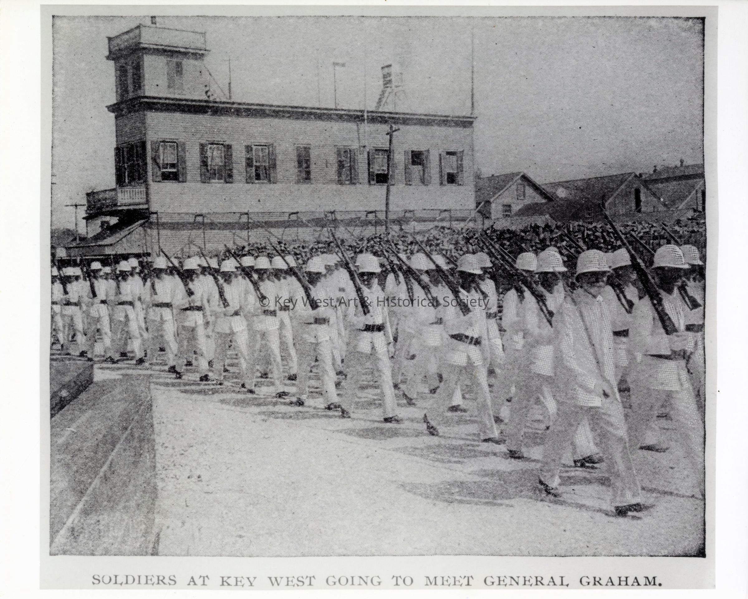 Black and white photograph of soldiers marching down a Key West street to meet General Graham.