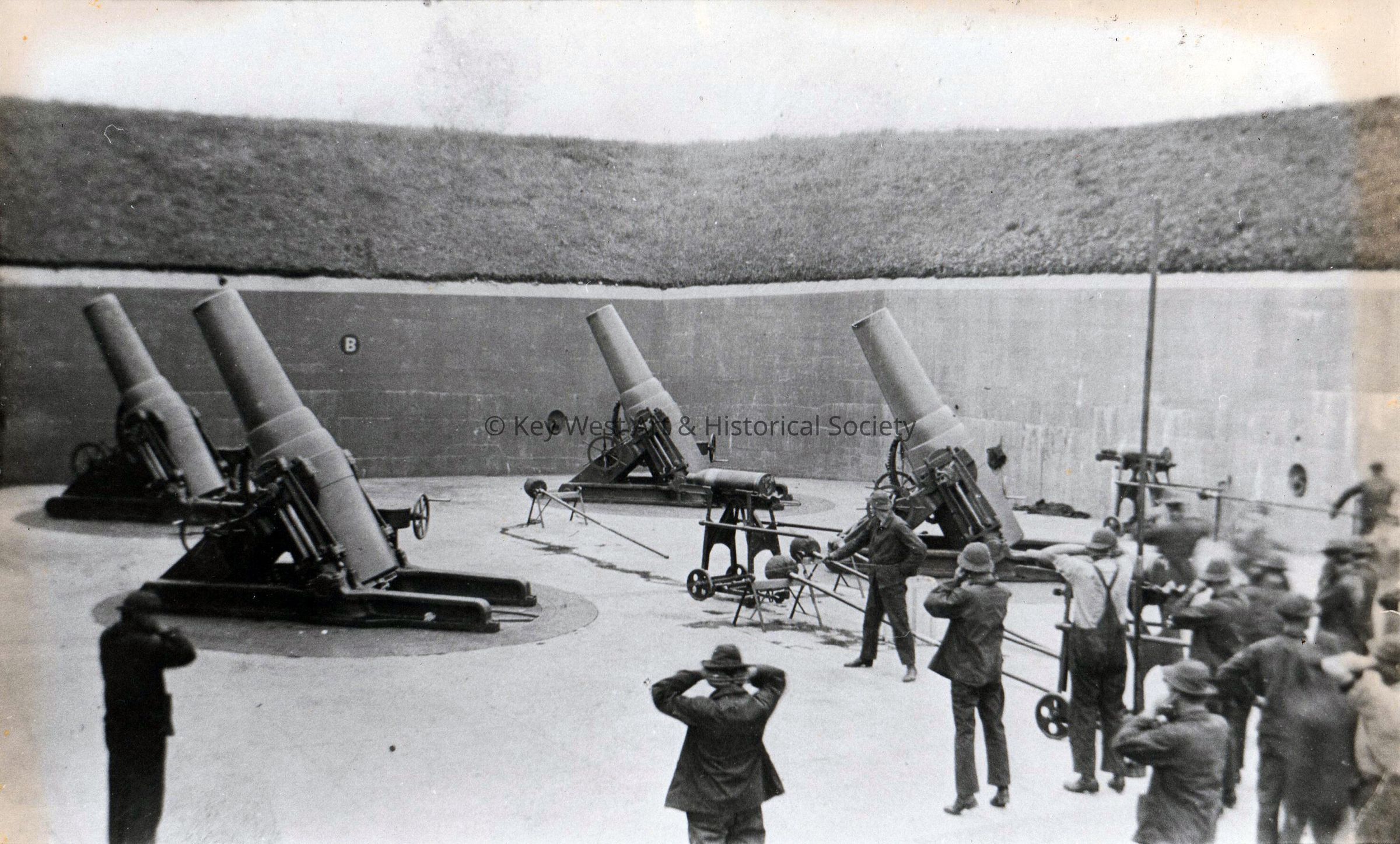 Black and white photograph of soldiers, possibly the Florida National Guard, covering their ears as large guns are fired from a bunker.