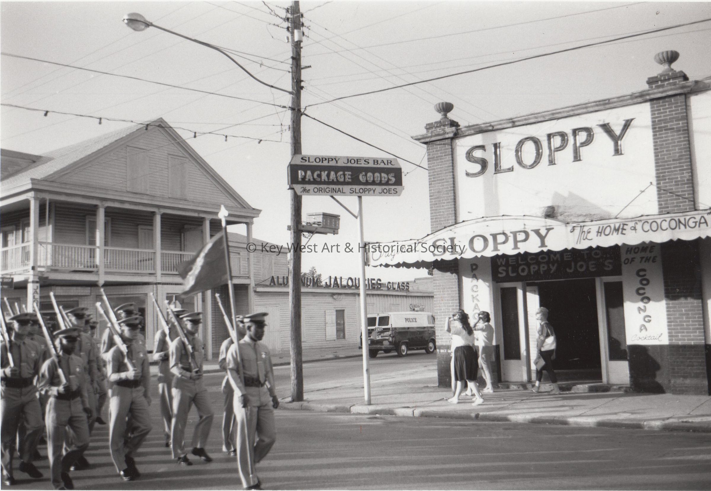 Black and white photograph of soldiers marching on the 200 block of Duval Street near Sloppy Joe's Bar.Photograph Details