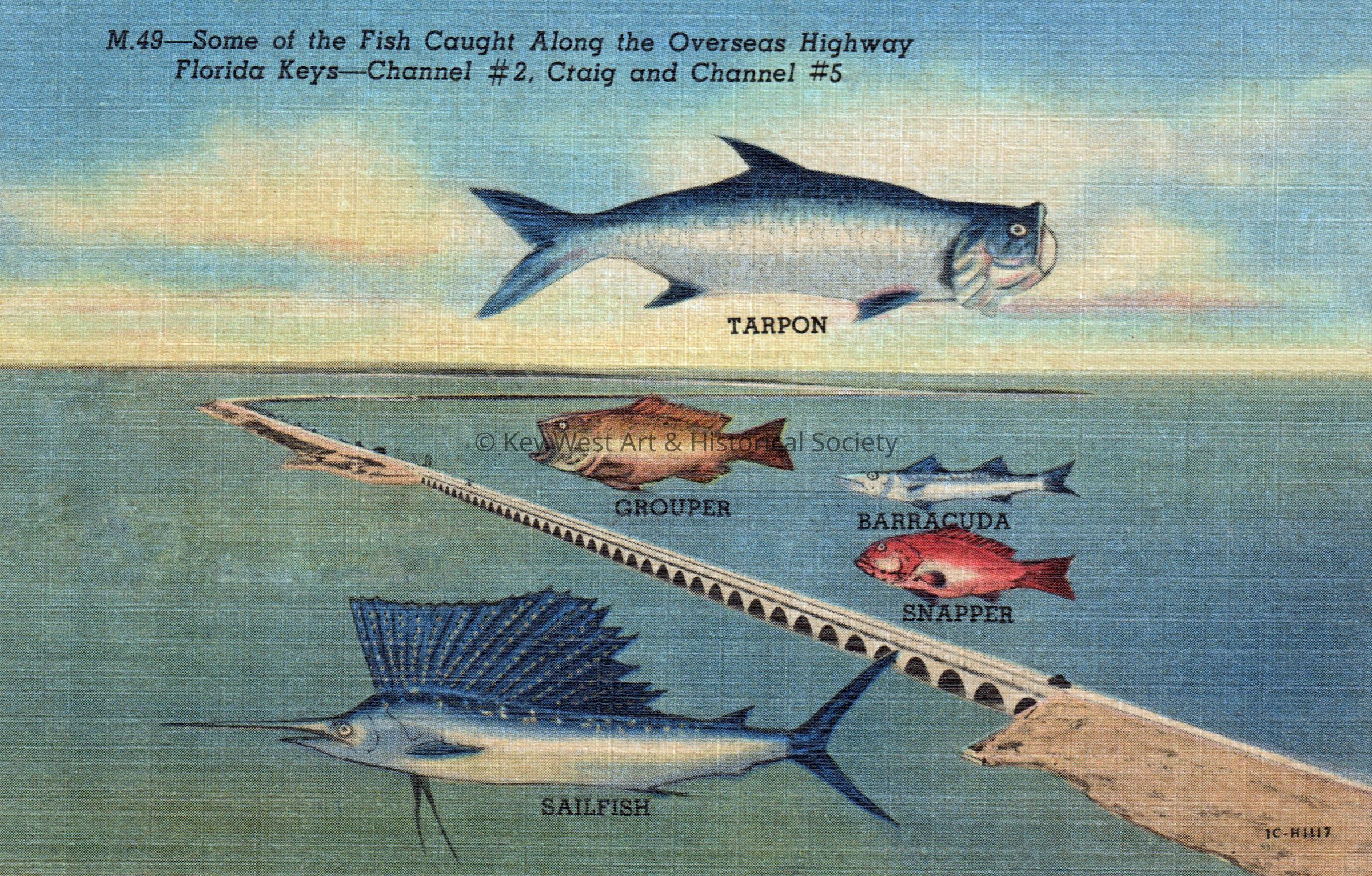 Postcard depicting illustrations of various fish near the Overseas Highway. The caption reads, ‘Some of the fish caught along the Overseas Highway, Florida Keys, channel #2, Craig, and channel #5 - tarpon, grouper, barracuda, snapper, sailfish’.Subject Place