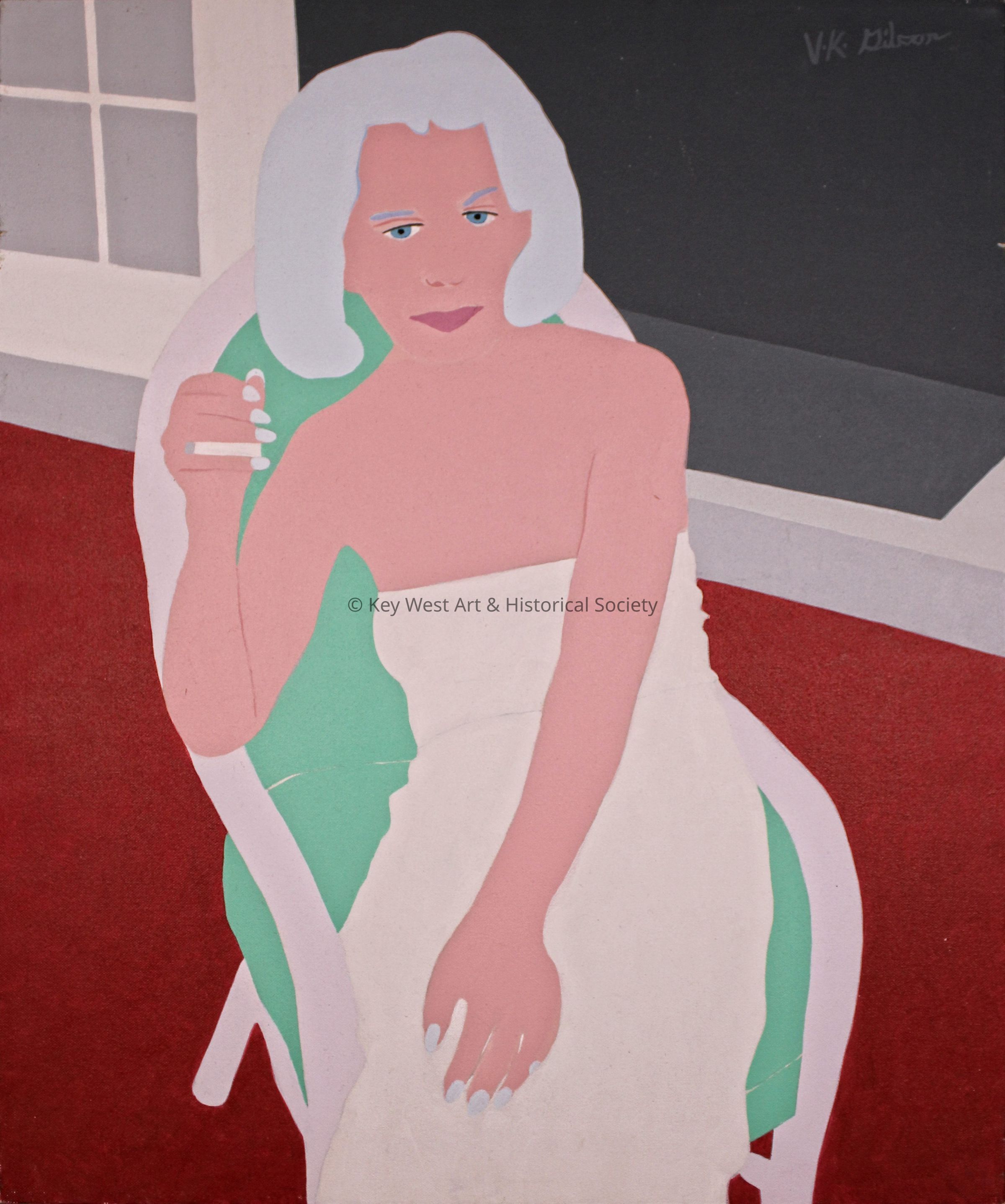 Acrylic on canvas portrait by Vaughn Gibson depicting Sondra Schneider seated in a chair smoking a cigarette.Type of Painting
