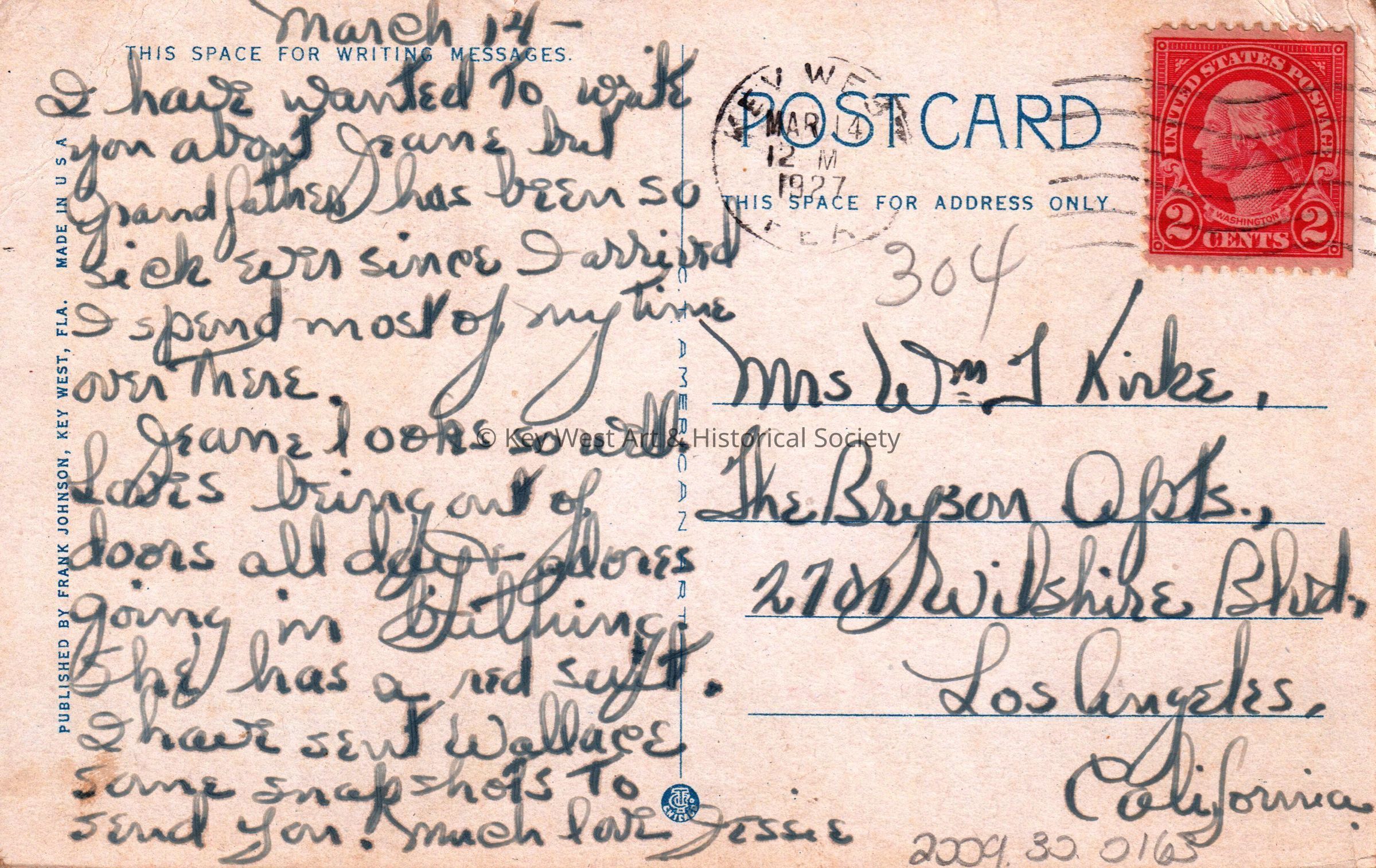Postcard depicting homes and palm trees near the ocean. The caption reads, ‘South Beach homes and Cocoanut palms, Key West, Florida, furthest point south in the U.S.A.’ The message on the verso reads, ‘March 14, I have wanted to write you about Jeane, but Grandfather has been so sick ever since I arrived. I spend most of my time over there. Jeane looks so well, loves being out of doors all day, adores going in bathing. She has a red suit. I have sent Wallace some snapshots to send you. Much love, Jessie’. The card is addressed to Mrs. William T. Kirk, The Bryson Apartments, 2701 Wilshire Boulevard, Los Angeles, California, and is postmarked Key West, March 14, 1927.Subject Place