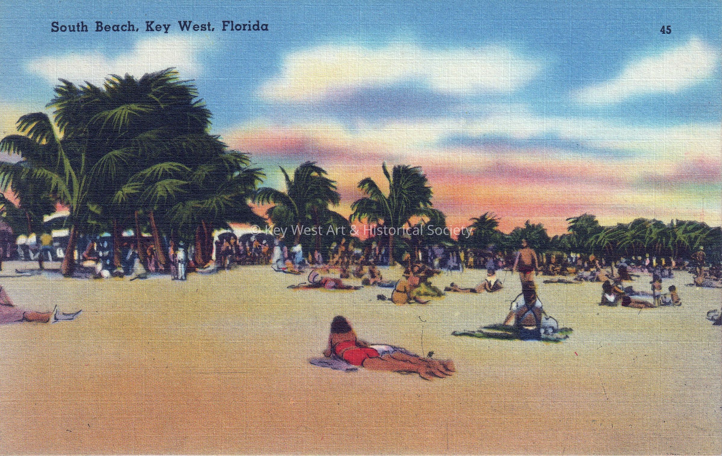 Postcard depicting sunbathers on a beach. The caption reads, ‘South Beach, Key West, Florida’. The description on the verso reads, ‘South Beach, one of Key West’s lovely tropical beaches for which this island paradise is noted. Joined to the mainland of Florida by the new Overseas Highway, it is fast becoming one of the most popular resort centers.’Subject Place