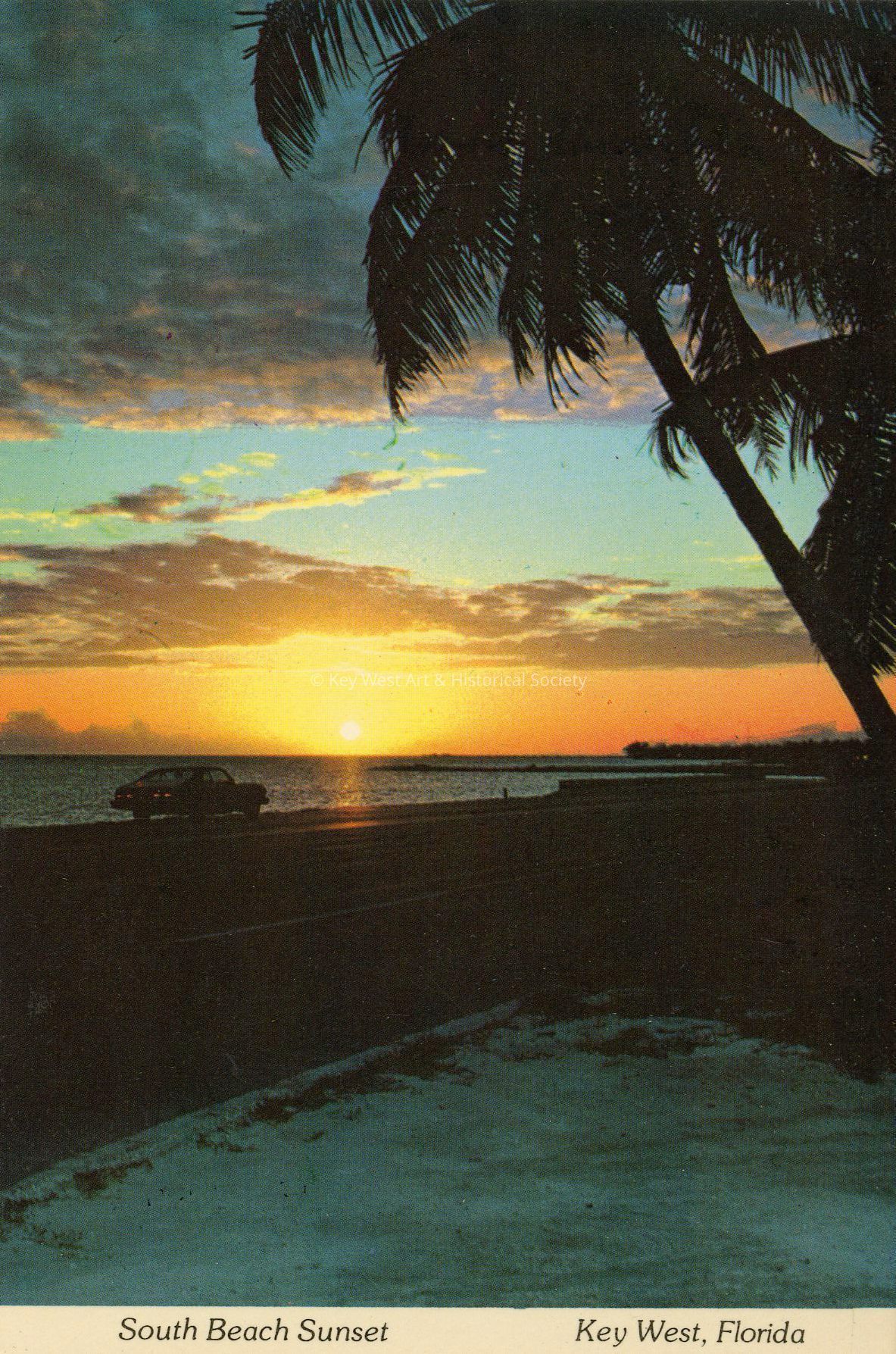 Postcard depicting a sunset along the south coast of Key West. Notation on verso, 'A blue, purple, gold and orange sunset goes down in a blaze of glory off South Beach in Key West, Florida. Tourists line the boulevard each night to photograph these sunsets.'Subject Place