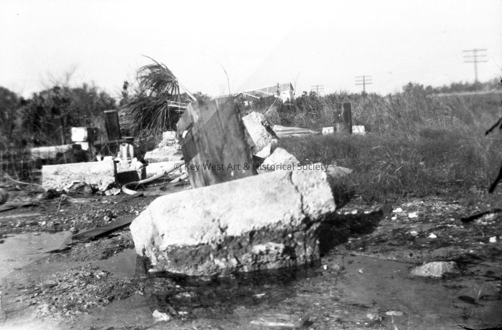 Black and white negative showing damage in South Florida created by an unknown hurricane.