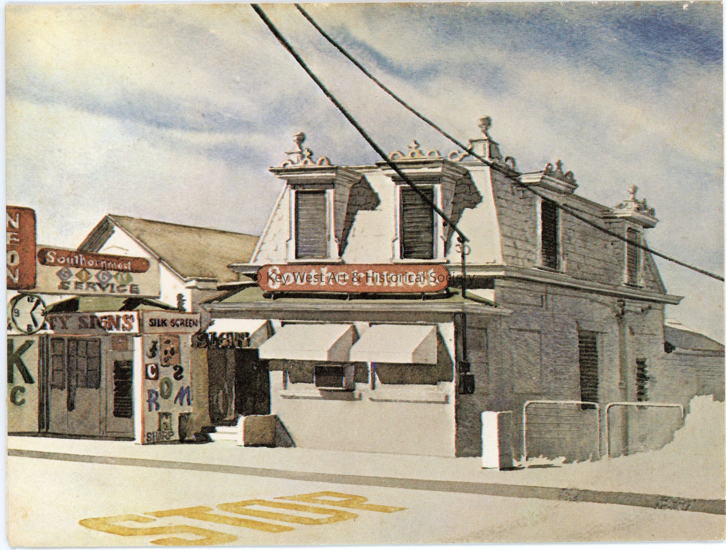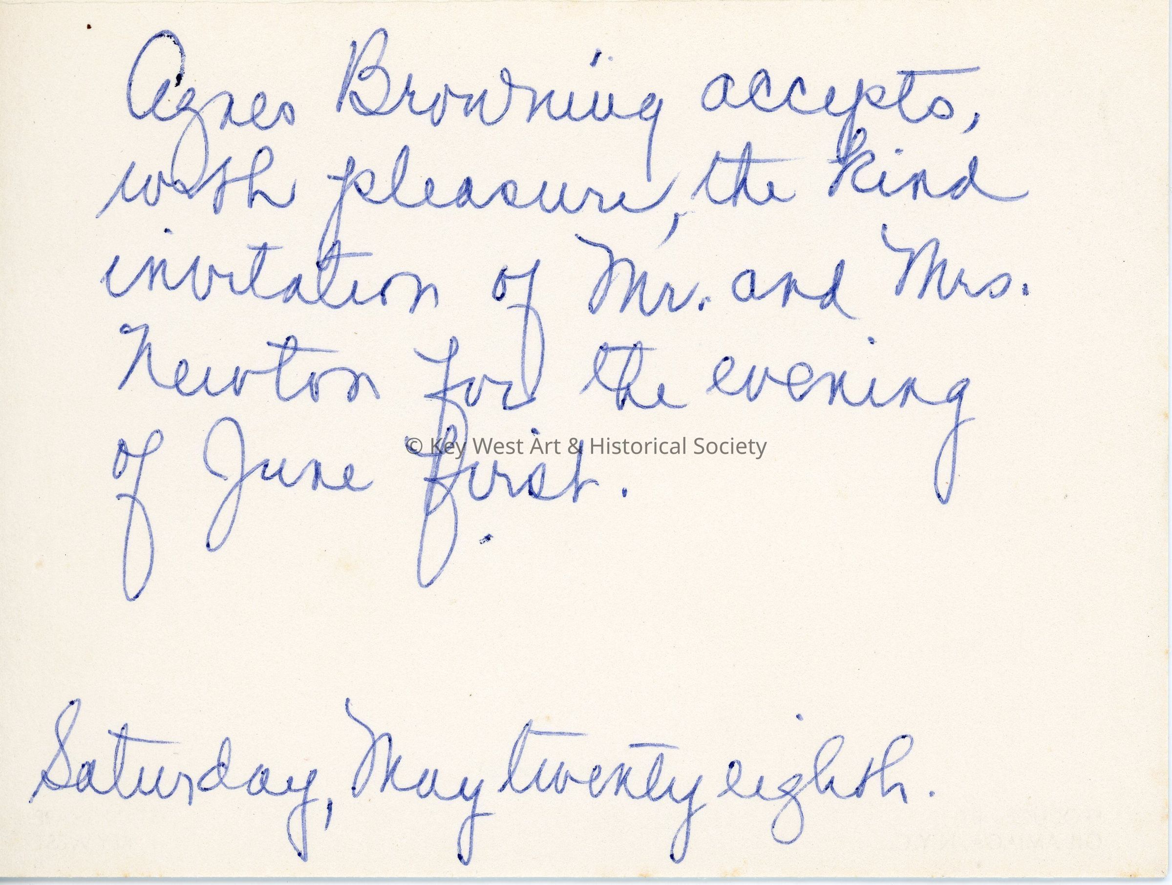 Paper card with a color print of the Southernmost Sign Service located at 913 Eaton Street. The card has a handwritten note inside, 'Agnes Browning accepts, with pleasure, the kind invitation of Mr. and Mrs. Newton for the evening of June first. Saturday May twenty eight.'