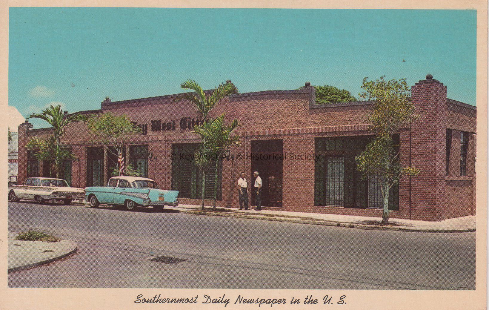 Postcard depicting the Key West Citizen office building formerly located on the 500 block of Greene Street. The caption reads, ‘Southernmost Daily Newspaper in the U.S.’ Notation on verso, ‘Founded over fifty years ago, brought to modern proportions by the late L. P. Artman, The Key West Citizen has chronicled the events of the island, its quaintness and its greatness. The Citizen is at present owned and edited by Norman Artman, son of the publisher, who recently restored the building in keeping with old island Architecture.’Subject Person/Organization