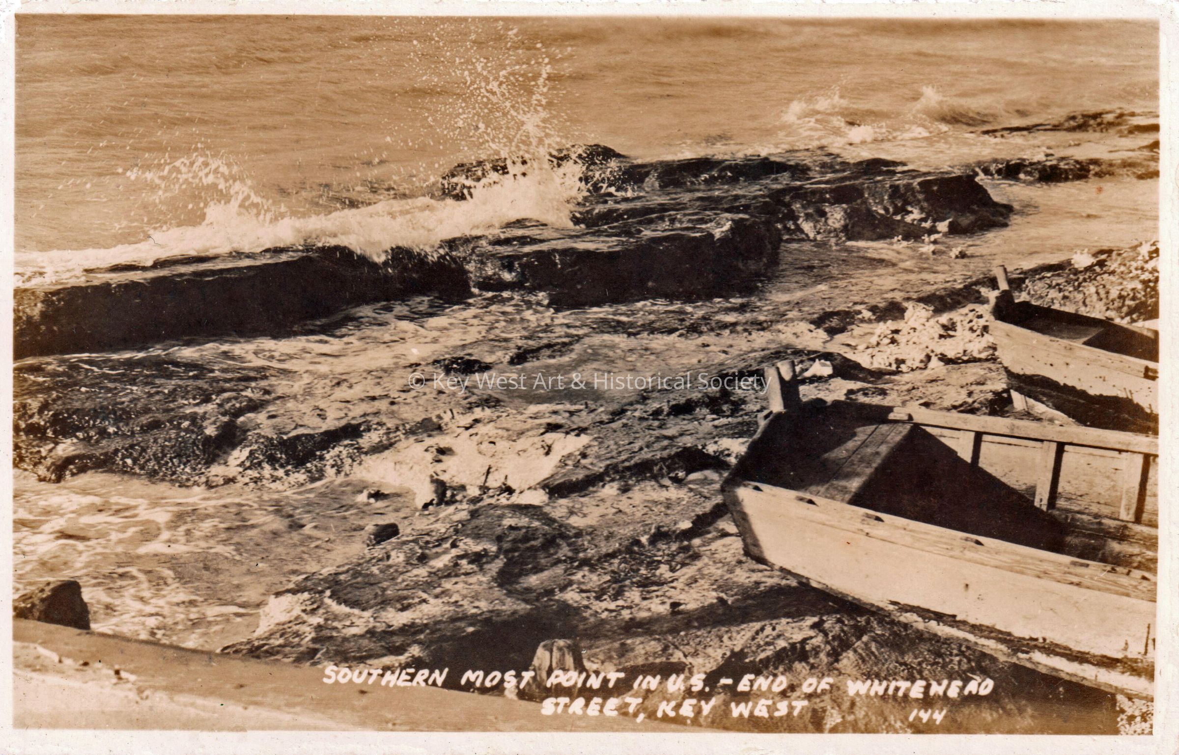 Postcard depicting boats pulled onto the rocks in front of water splashing onto a sea wall. The caption reads, ‘Southernmost point of U.S. - end of Whitehead Street, Key West’.Collection