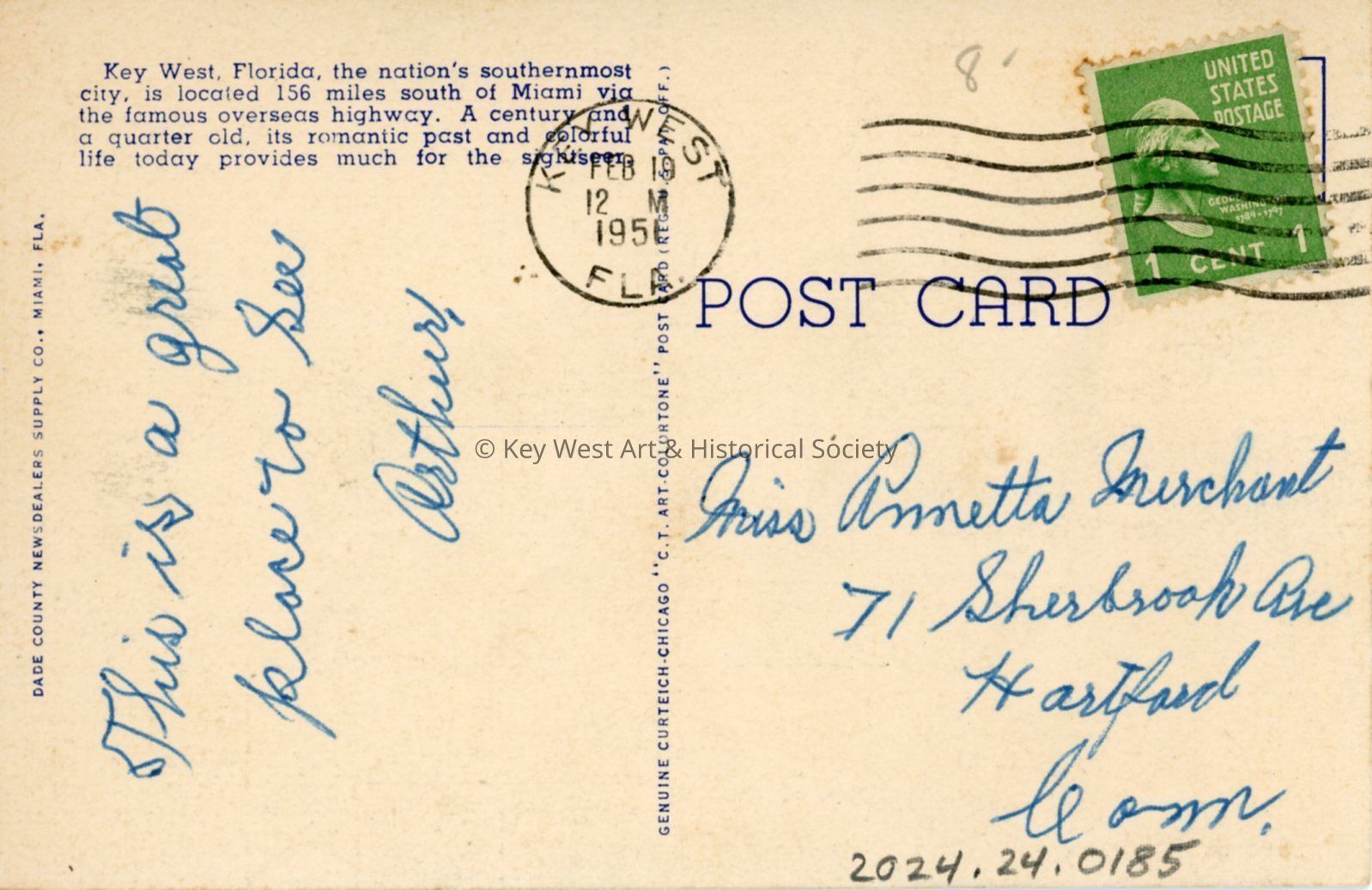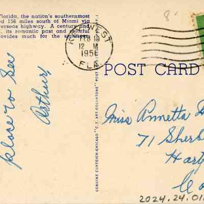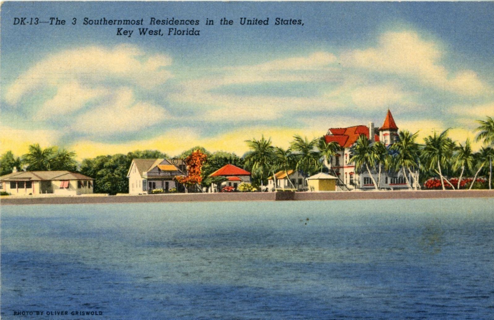 Postcard depicting Southernmost residences in the United States, Key West, Florida. "Key West, Florida, the nation's southernmost city, is located 156 miles south of Miami via the famous overseas highway. A century and a quarter old, its romantic past and colorful life today provides much for the sightseer."Collection