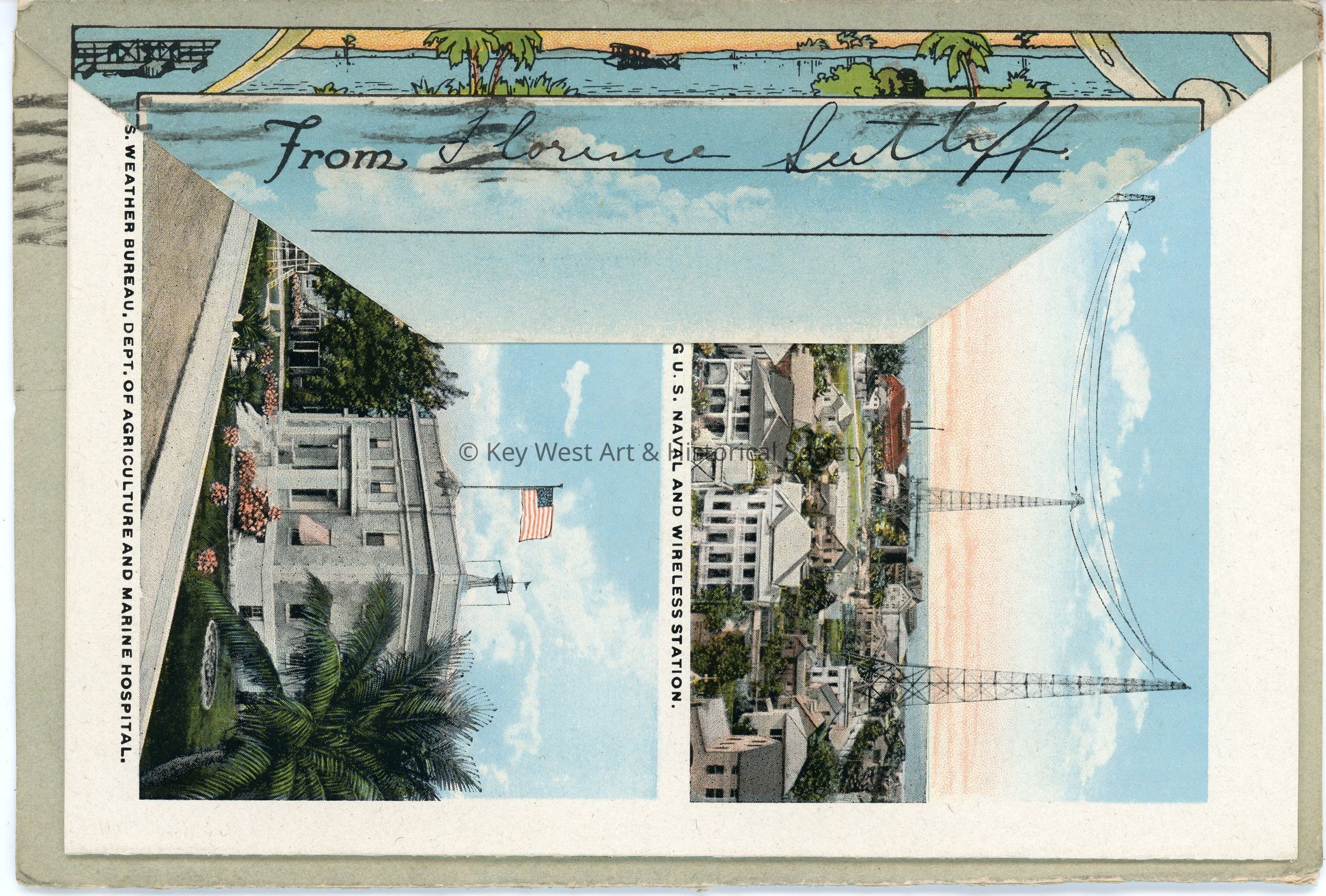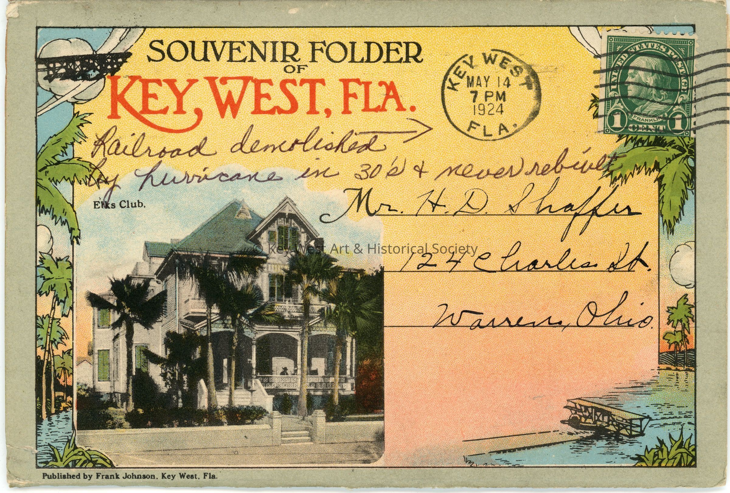 Accordion postcard folder with text reading "Souvenir Folder of Key West, FLA." Along with various color illustrations of prominent Key West sights, there is a text overview of the offerings of Key West and its planned growth as of circa 1924.Subject Place