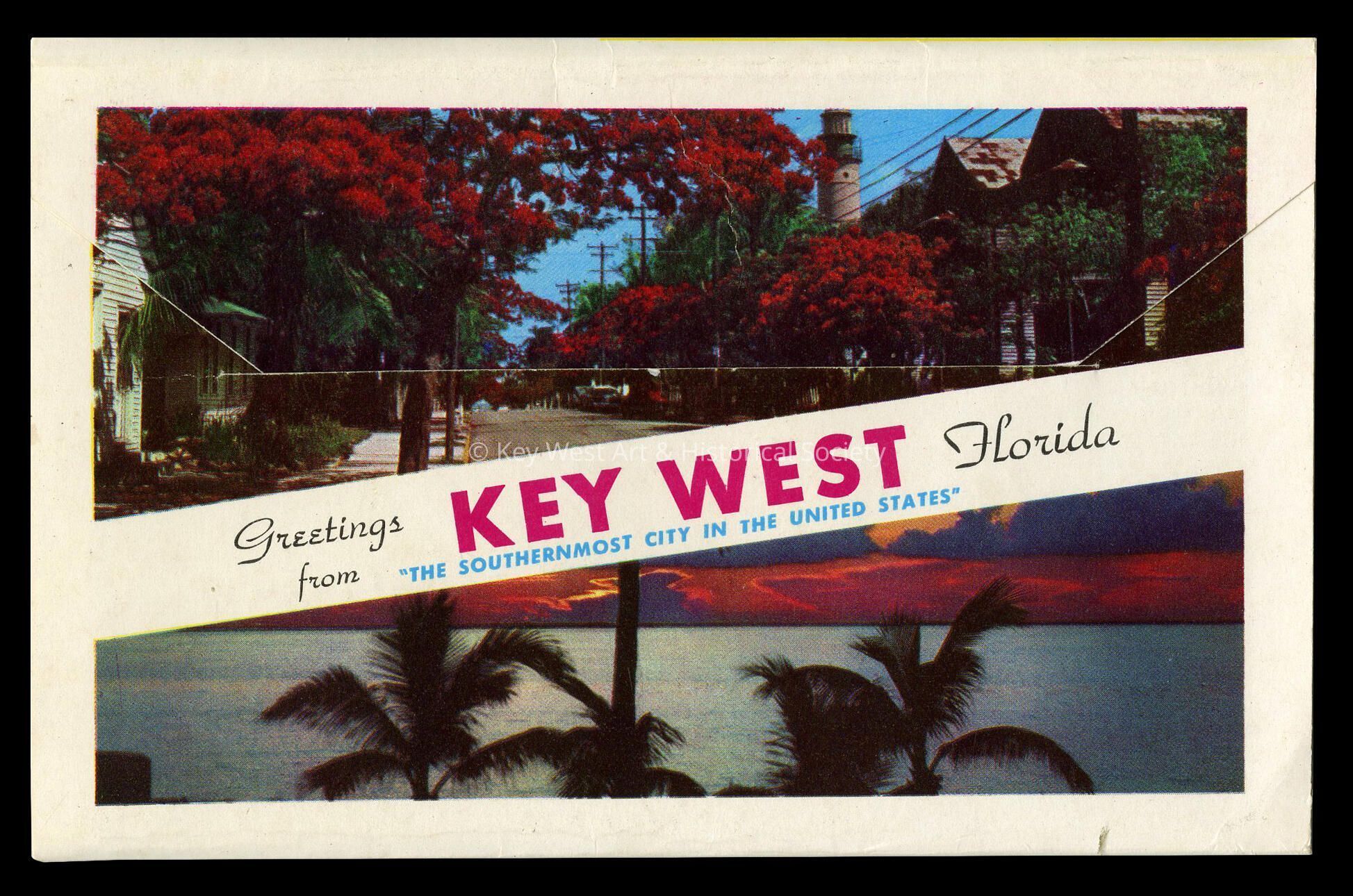 Souvenir folder of cards depicting scenes along the Overseas Highway and in Key West. There are 12 images in all, printed on 6 cards folded accordion-style. The caption reads, 'Greetings from Key West Florida, The Southernmost City in the United States'.