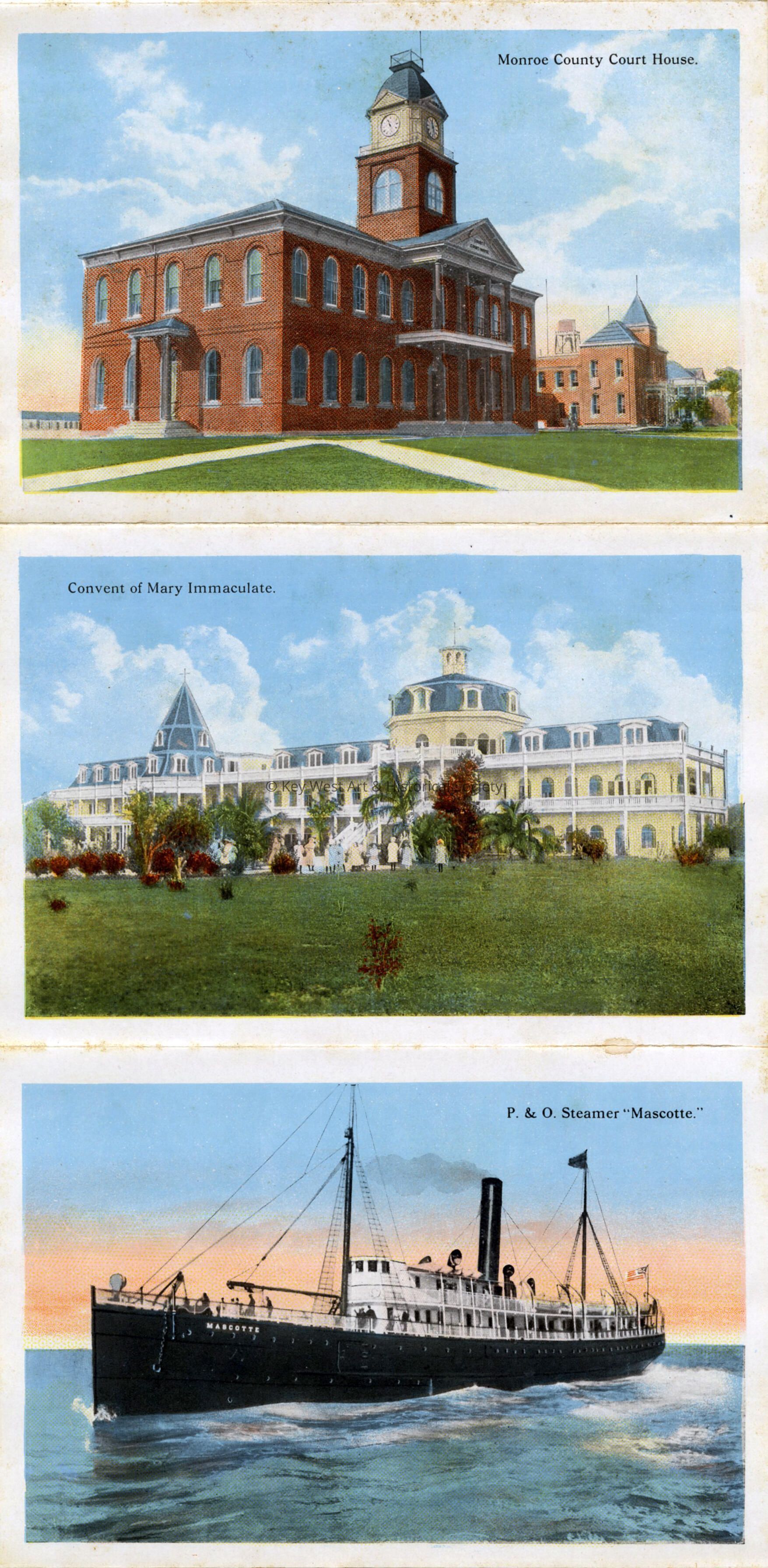 Souvenir postcard folder containing 22 images. Bird's eye view of Key West, Florida East Coast Railway Bahia Honda Bridge, U.S.S. Maine Memorial, Train Crossing Bahia Honda Bridge, Customs House, Train crossing Long Key, East India Banyan Tree, Train crossing Long Key Bridge, Coconut Palms at the Barracks, P &O Steamer Olivette, P & O Steamer Mascotte, Sponge Catch For Sale, Convent of Mary Immaculate, Unloading of Sea Turtles, Monroe County Court House, Court Yard of Fort Martello, Duval Street looking Northwest, Marine Hospital, South Beach, Government Wireless Station, Jefferson Hotel and Duval Street.Subject Place