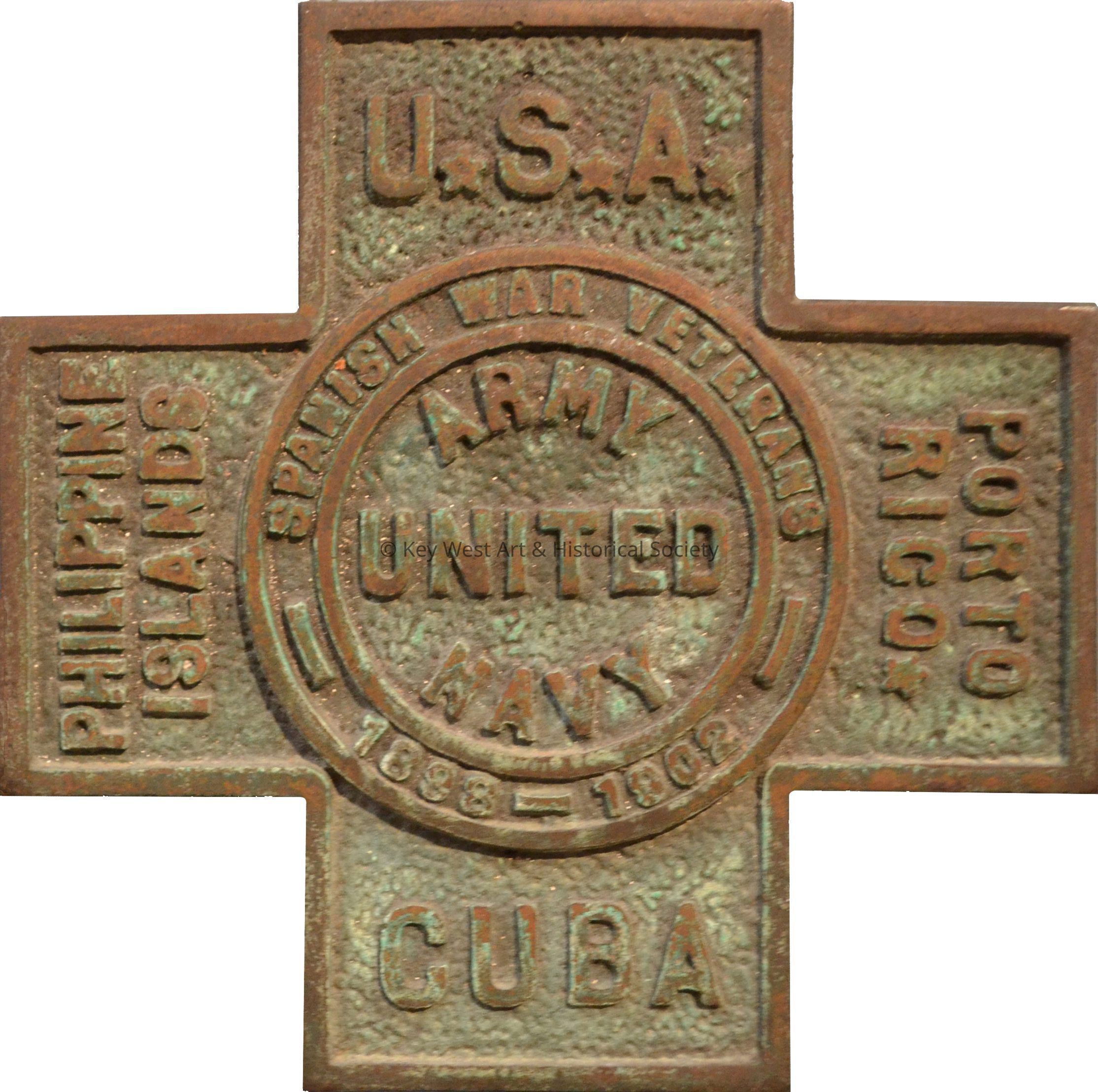 Spanish-American War cross-shaped bronze grave marker. Reads: "U.S.A. Cuba"