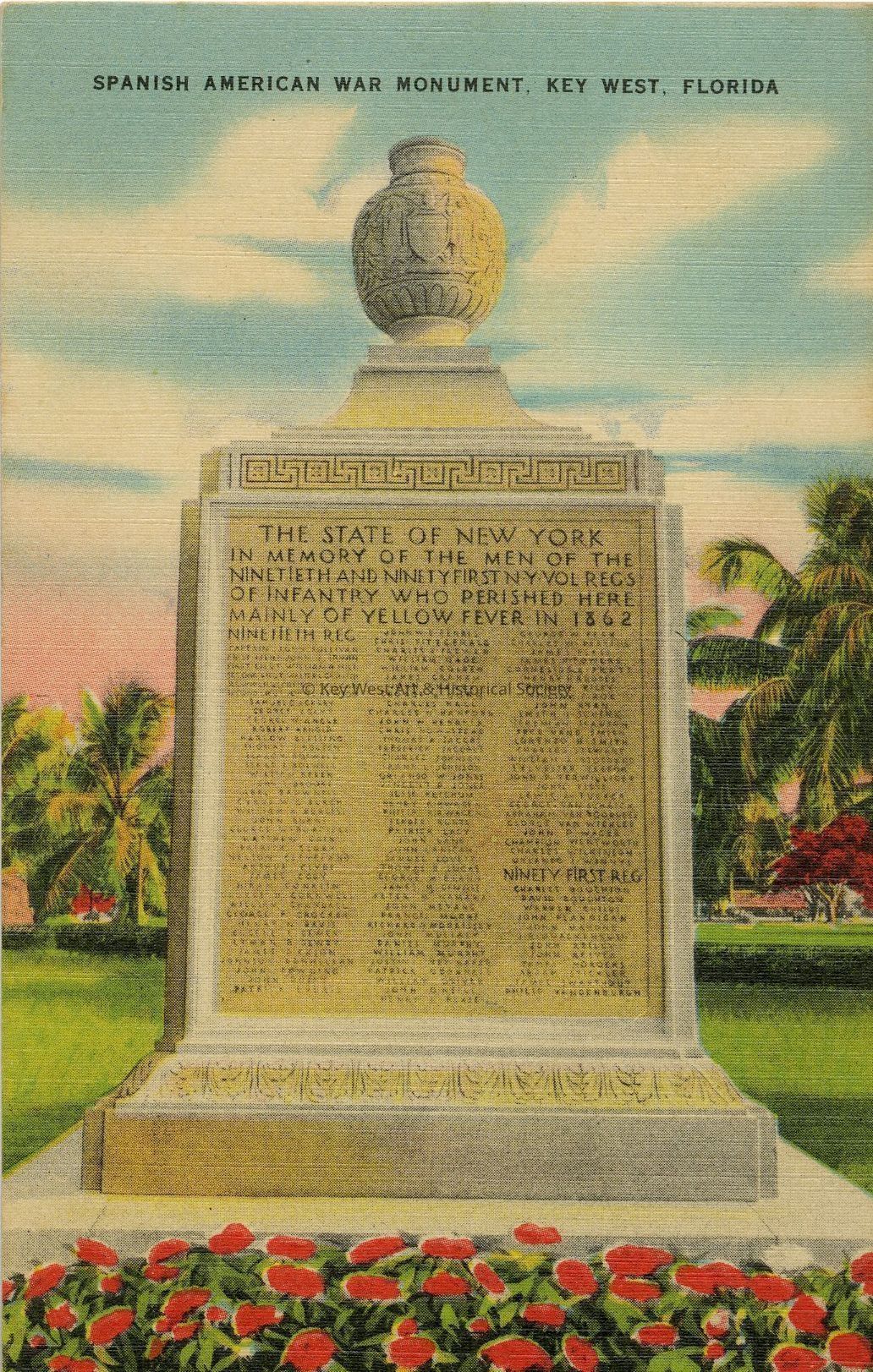 Postcard depicting the Spanish American War Monument in Key West, Florida. Notation on verso, 'This Monument was erected in memory of the men from New York State who lost their lives here. These men were of the 90th and 91st Voluntary Regiments from New York, and most of them died of yellow fever in 1862.'Collection
