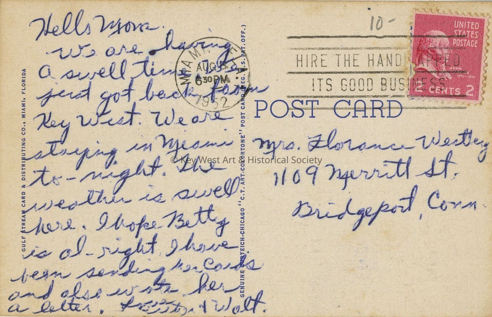 Hello Mom. We are having a swell time. Just got back from Key West. We are staying in Miami to-night. The weather is swell here. I hope Betty is al-right. I have been sending her cards and also wrote her a letter.Dimensions