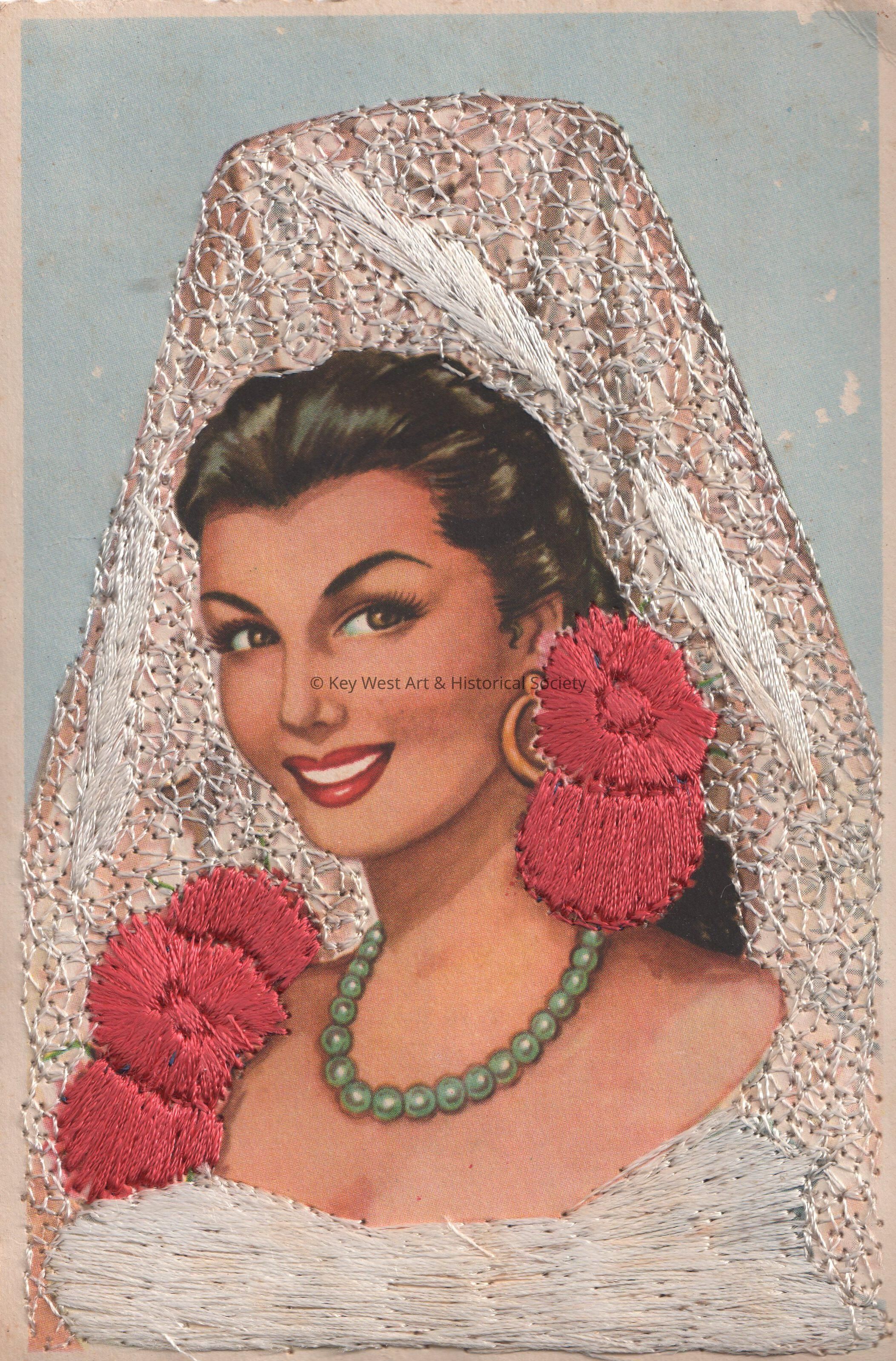 Postcard depicting a Spanish woman whose dress is covered with stitched threads and whose mantilla is made of lace.