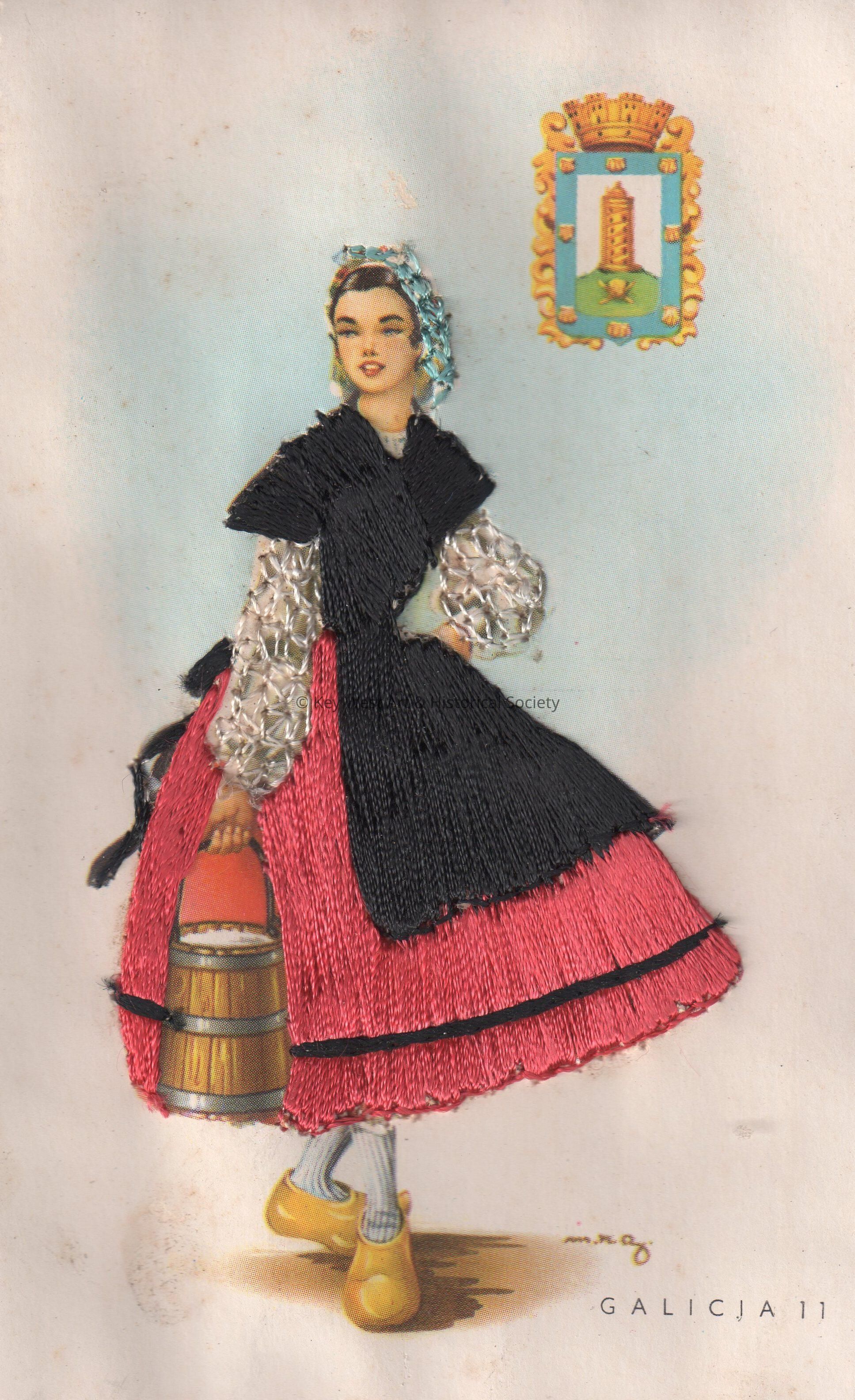 Postcard depicting a Spanish woman carrying a bucket. Her dress is covered with stitched threads. The caption reads, ‘Galicia’. The card is signed on the front by M.N.G.