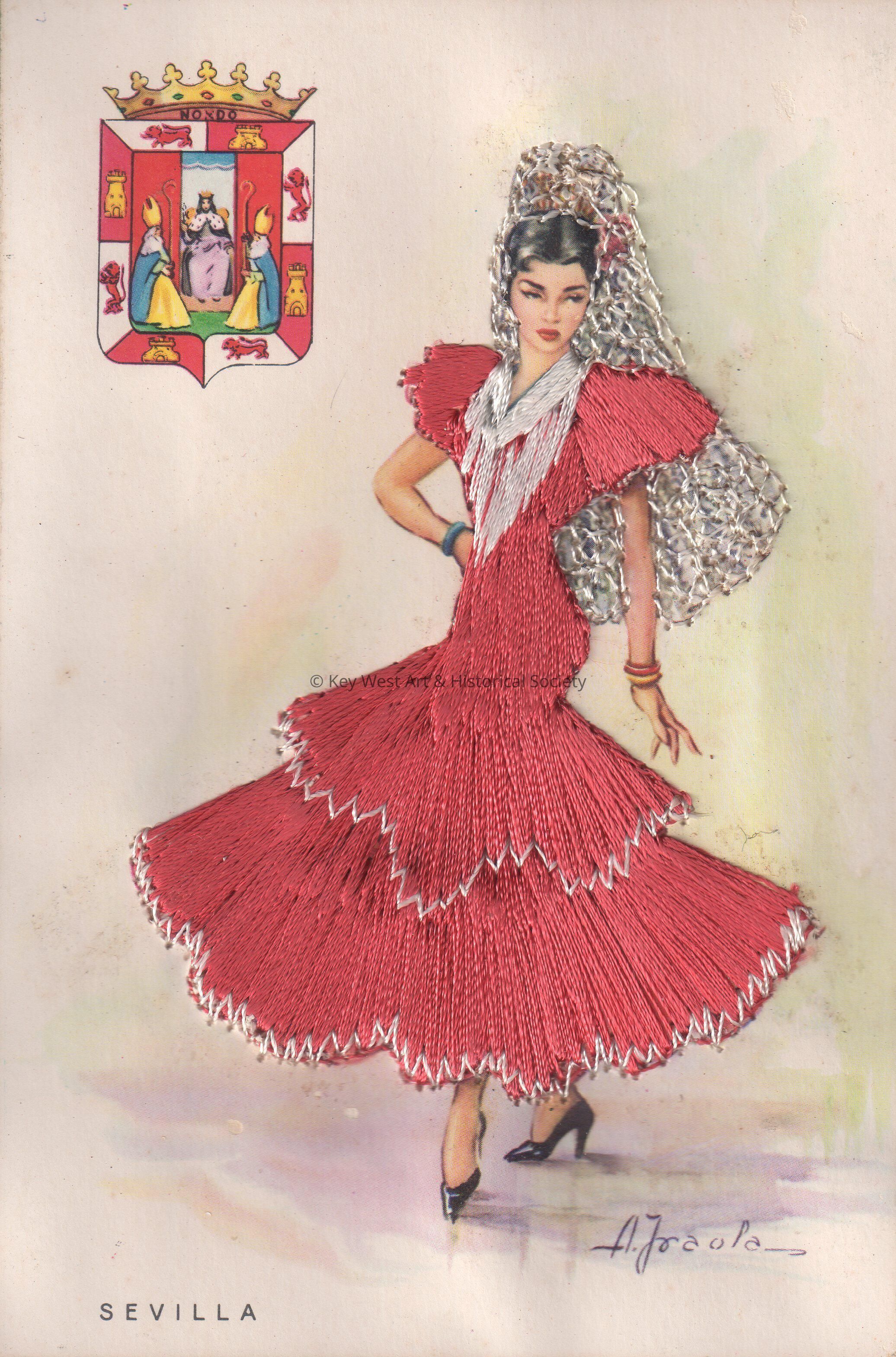 Postcard depicting a Spanish woman whose dress is covered with stitched threads and her mantilla is made of lace. The caption reads, ‘Sevilla’. The card is signed on the front by A. Fraola.