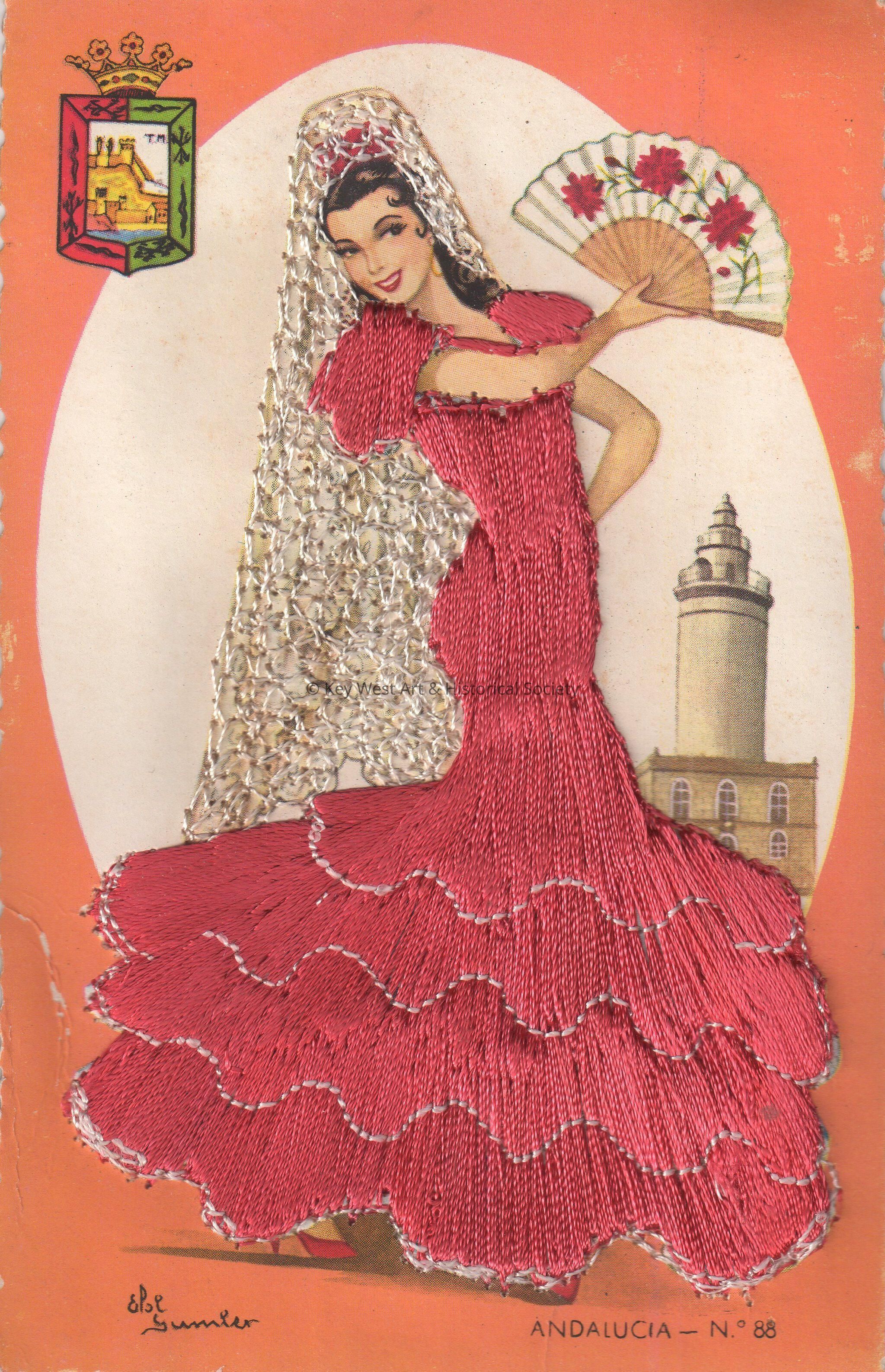 Postcard depicting a Spanish woman with a fan near a castle whose dress is covered with stitched threads and whose mantilla is made of lace. The caption reads, ‘Andalucia’. The card is signed on the front by Elsi Gumier.Subject Place