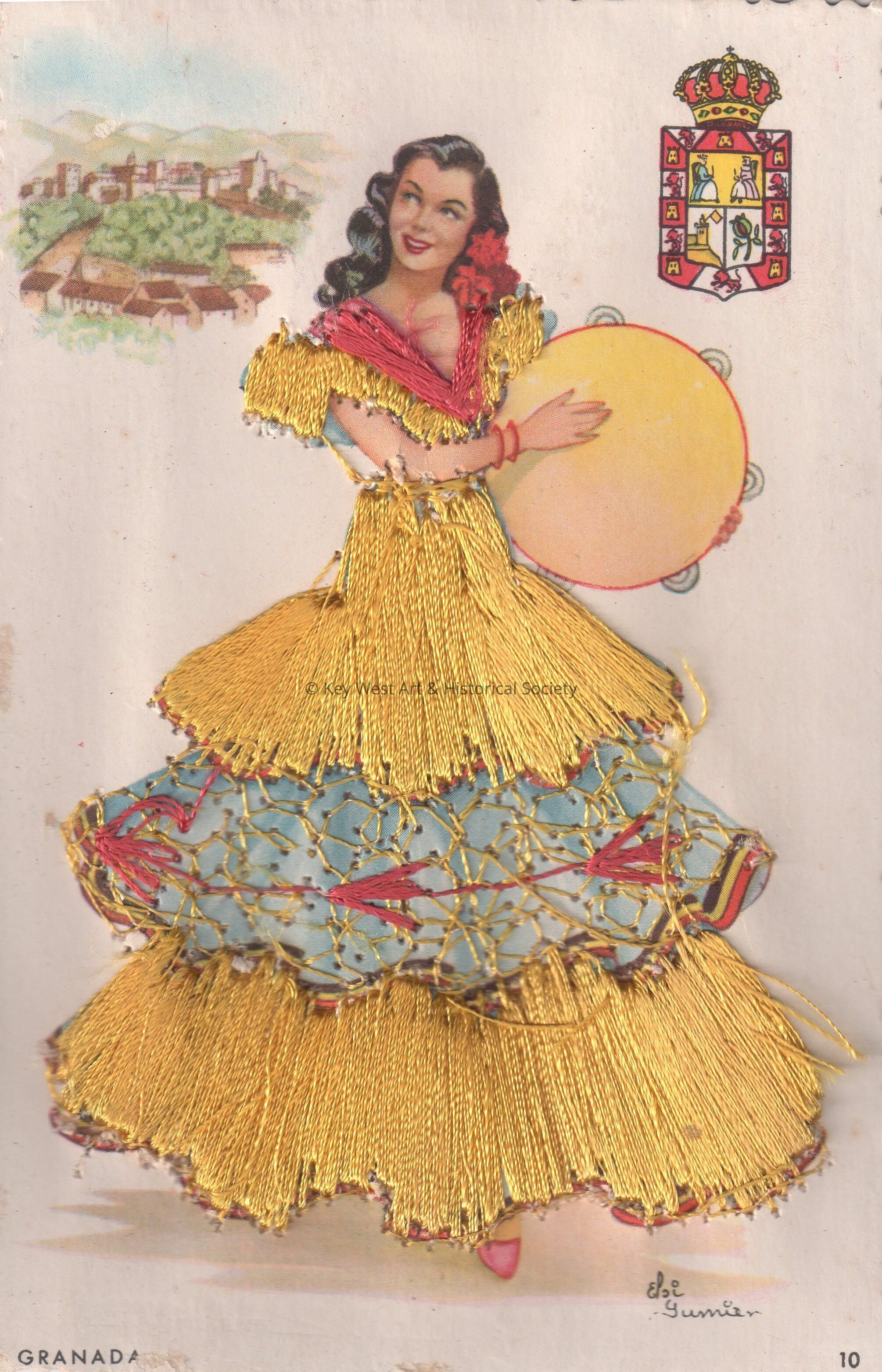 Postcard depicting a Spanish woman with a tambourine in front of a town. Her dress is covered with stitched threads. The caption reads, ‘Granada’. The card is signed on the front by Elsi Gumier.