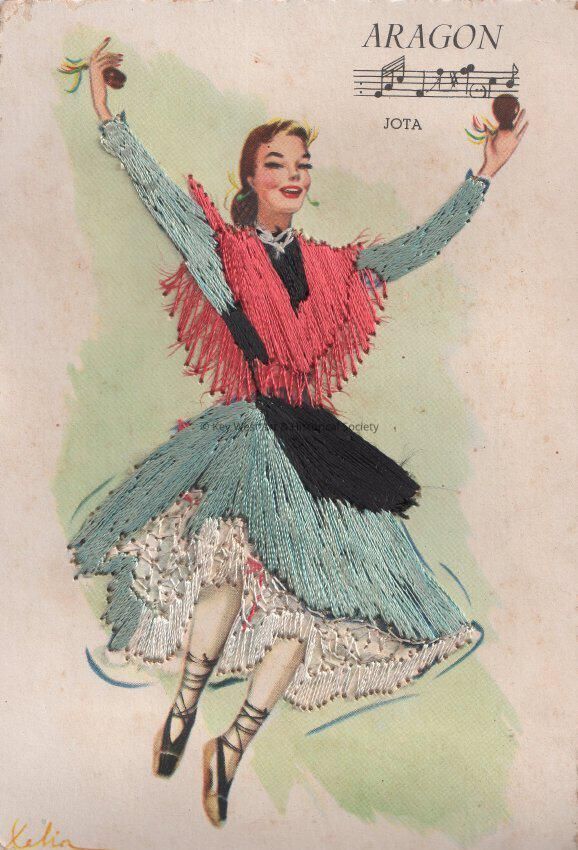 Postcard depicting a Spanish woman dancing with castanets whose dress is covered with stitched threads. The caption reads, ‘Aragon, Jota’. The card is signed on the front by Xelia.Collection