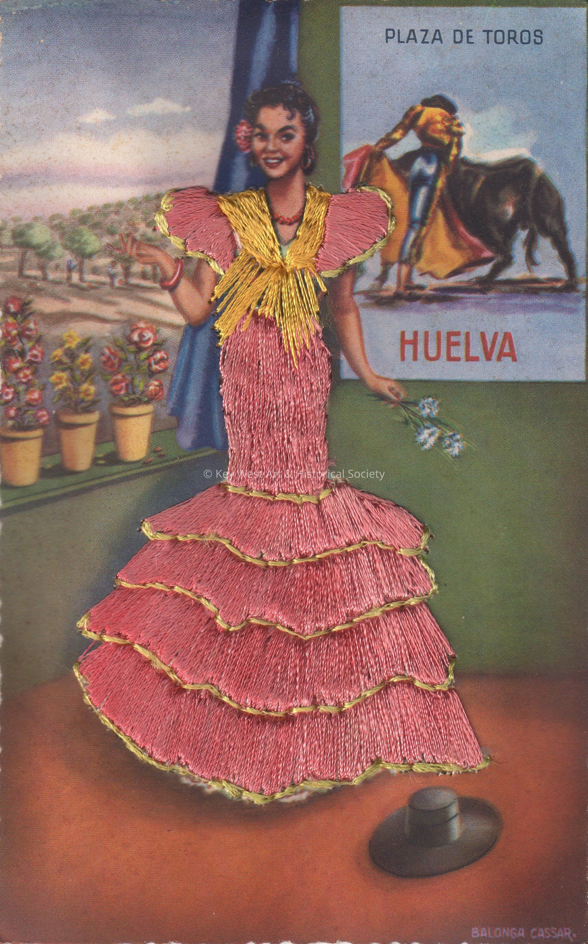 Postcard depicting a Spanish woman with a hat and flowers in front of a window and a poster of a bullfight. Her dress is covered with stitched threads. The poster reads, ‘Plaza de Toros, Huelva’. The card is signed on the front by Baling Cassar.Collection