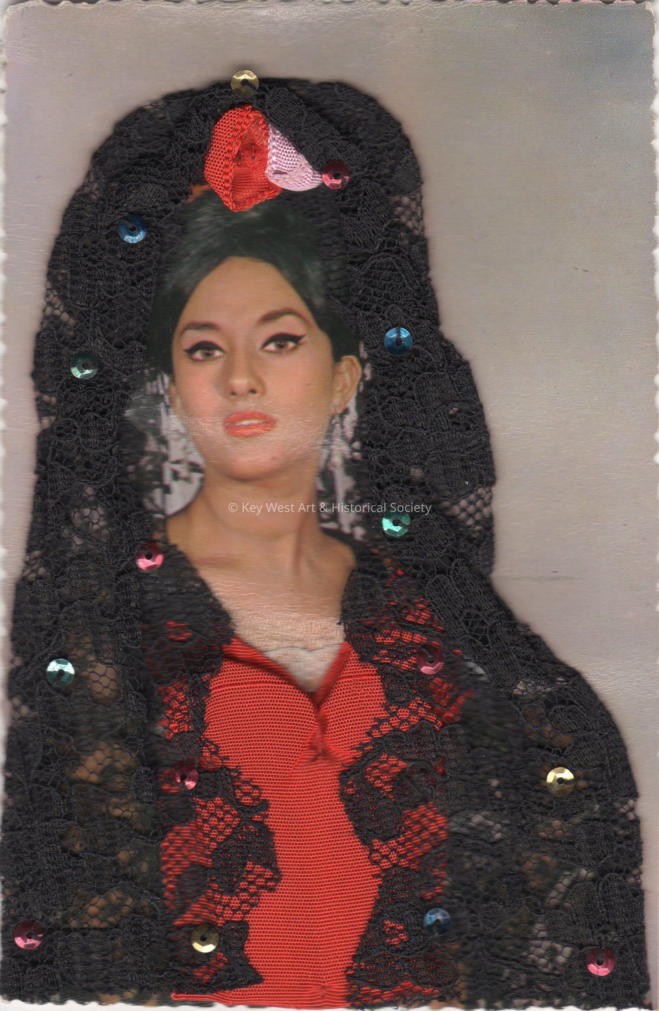Postcard of a woman with a Spanish Mantilla made of lace and sequins.