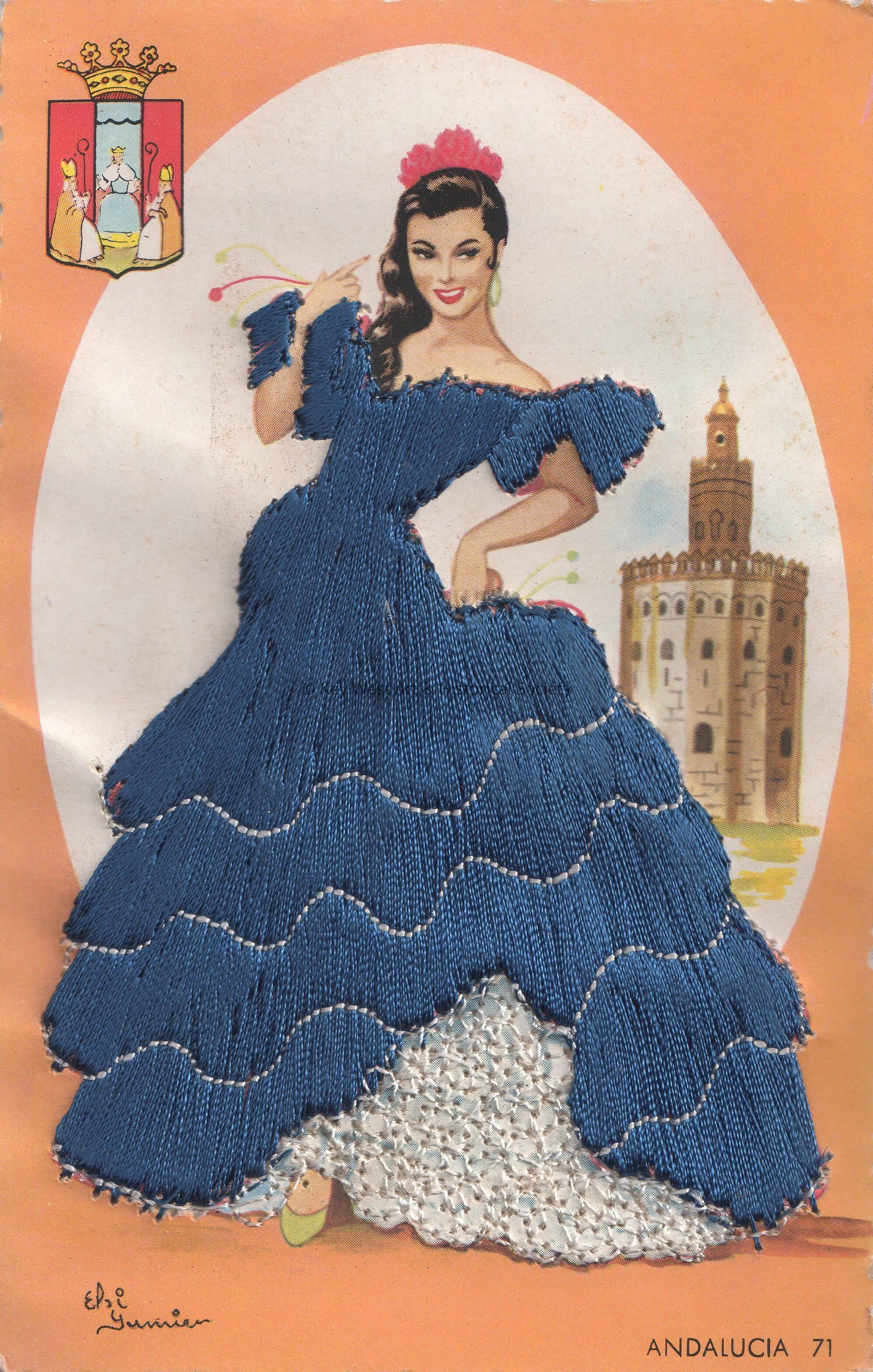 Postcard depicting a Spanish woman near a castle whose dress is covered with stitched threads. The caption reads, ‘Andalucia’. The card is signed on the front by Elsi Gumier.