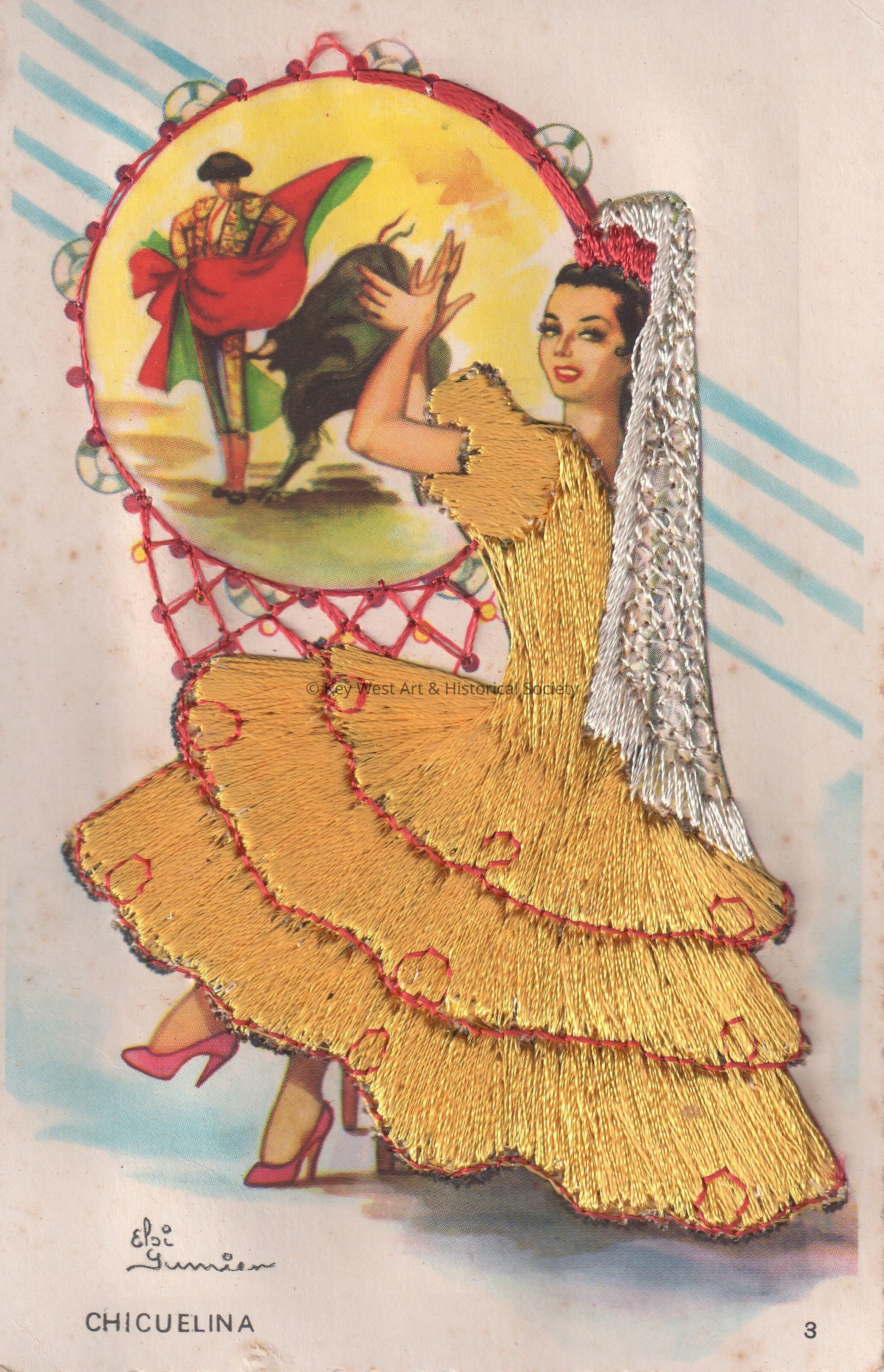 Postcard depicting a Spanish woman with a large tambourine. The tambourine contains a picture of a bullfight, and her dress is covered with stitched threads. The caption reads, ‘Chicuelina’. The card is signed on the front by Elsi Gumier.Collection