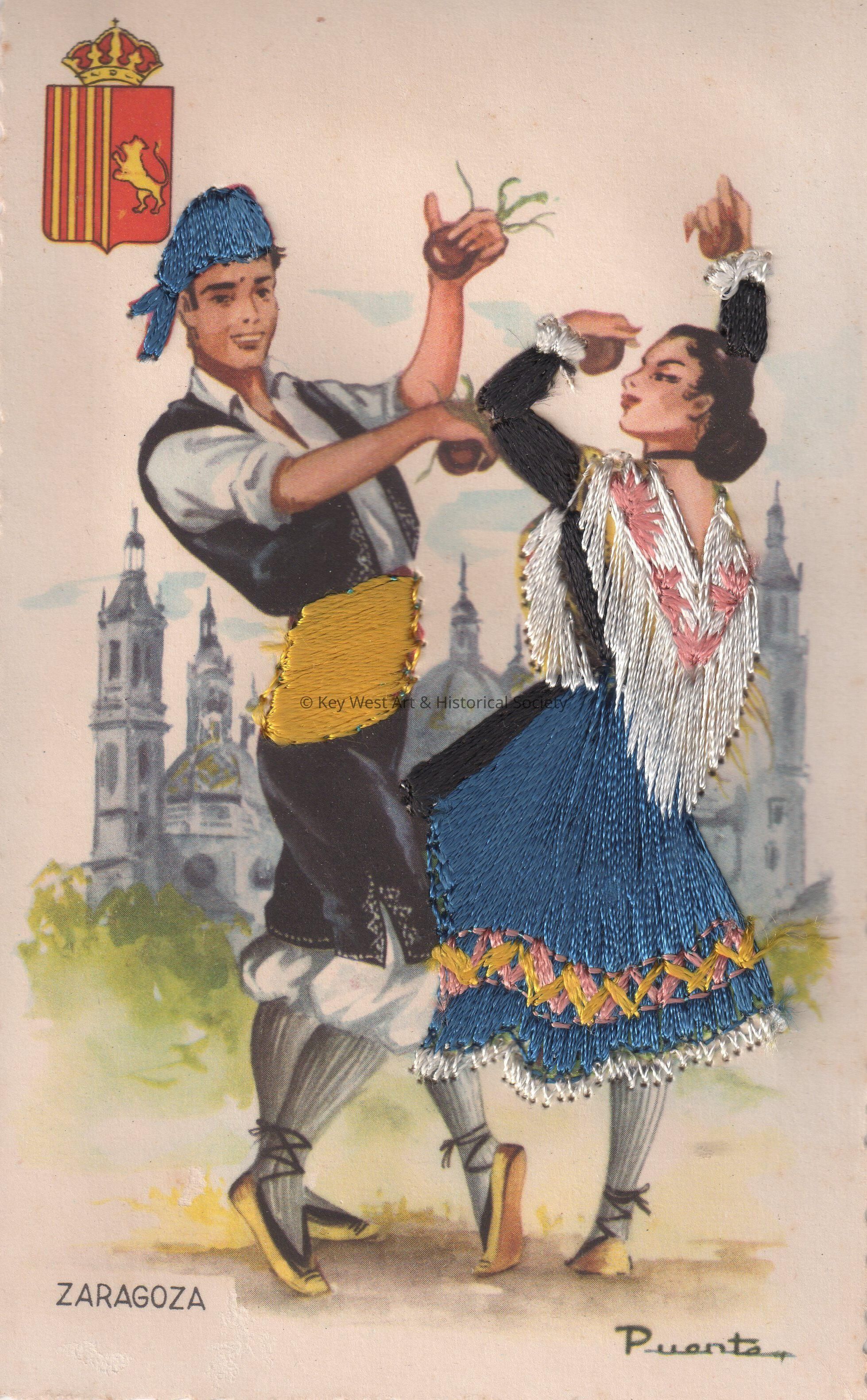 Postcard depicting a Spanish woman and man dancing with castanets in front of a building. Her dress is covered with stitched threads. The caption reads, ‘Zaragoza’. The card is signed on the front by Pesante.Collection