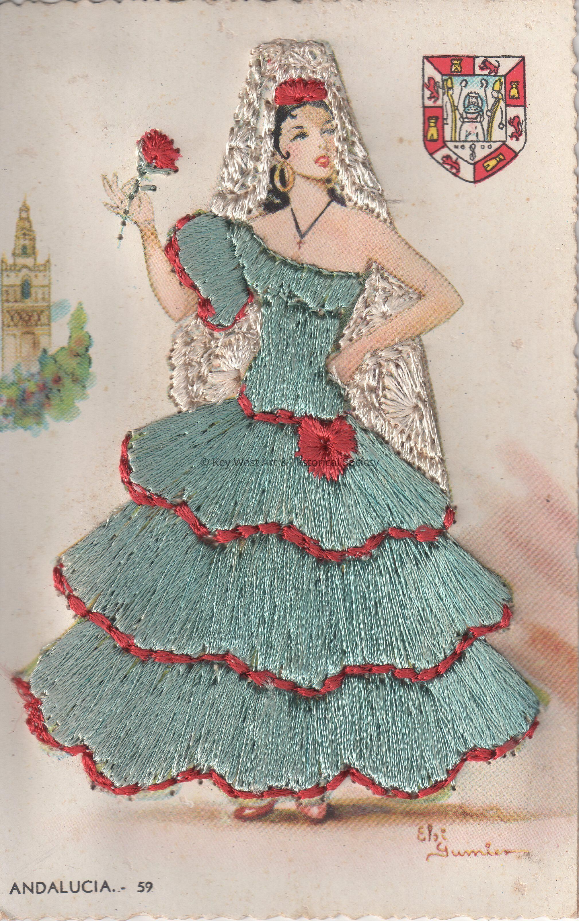 Postcard depicting a Spanish woman near a castle whose dress is covered with stitched threads, and whose mantilla is made of lace. The caption reads, ‘Andalucia’. The card is signed on the front by Elsi Gumier.Collection