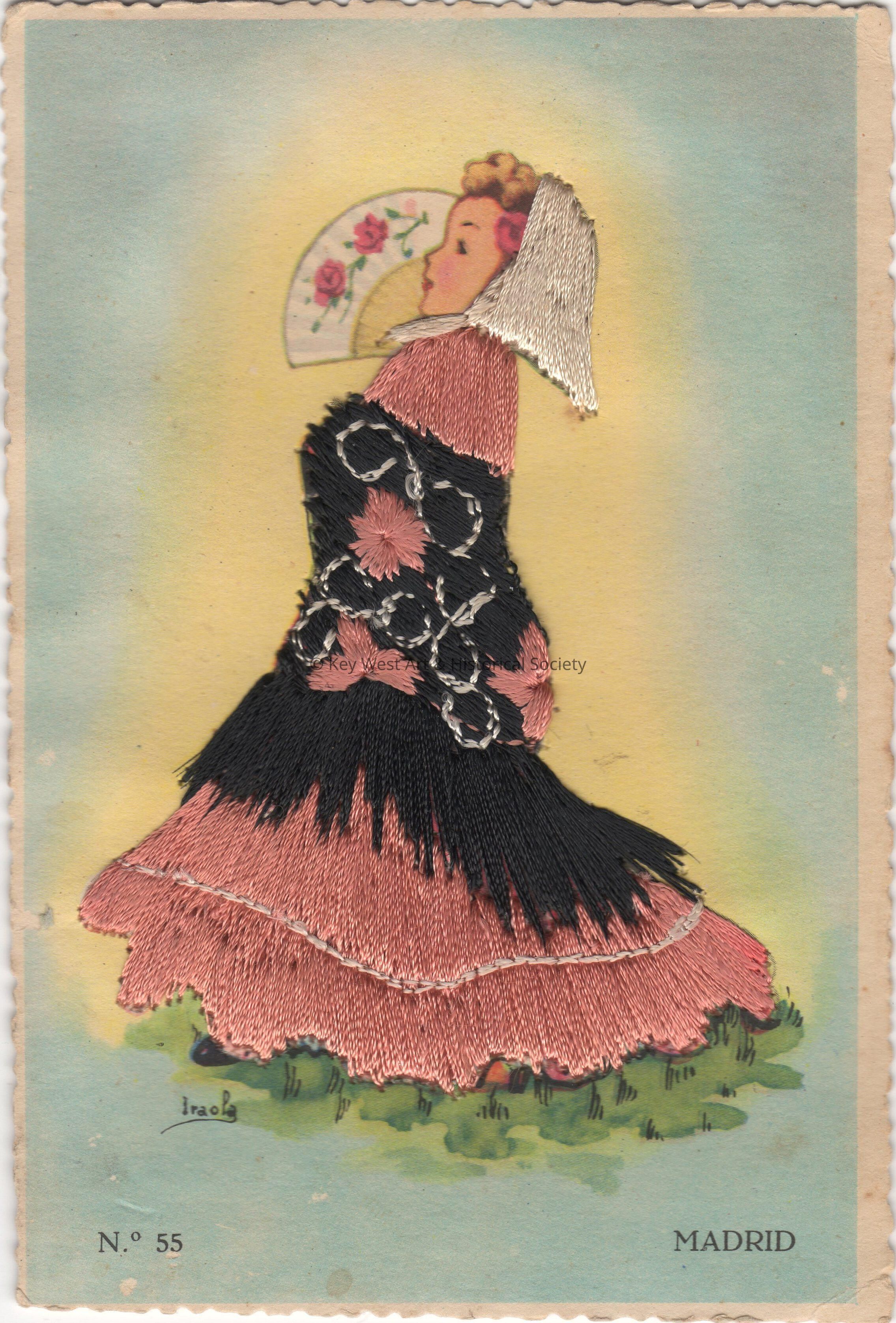 Postcard depicting a Spanish woman with a fan whose dress is covered with stitched threads. The caption reads, 'Madrid'.Collection