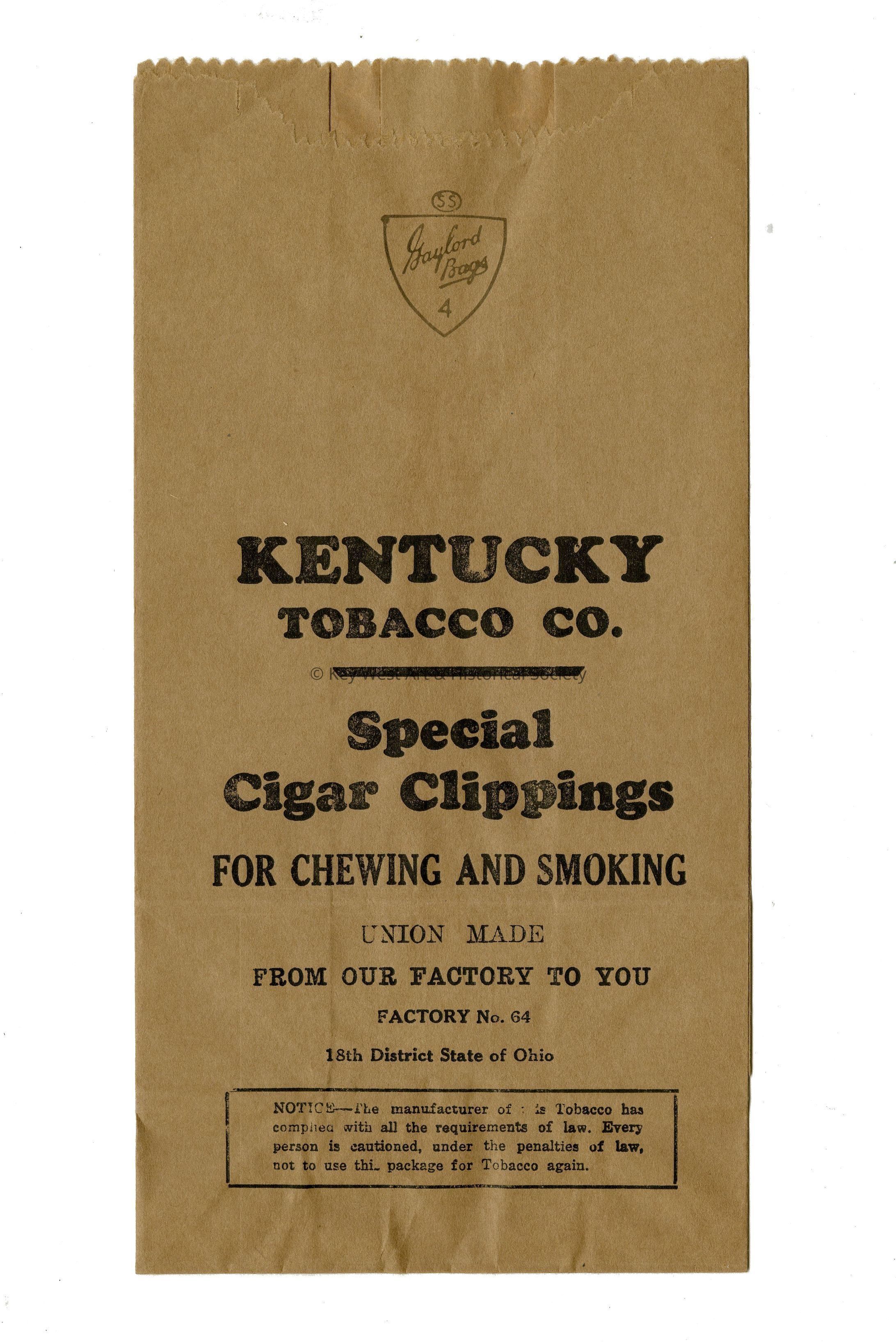 Unused brown paper bag intended to be used for special cigar clippings. Bag provided by the Kentucky Tobacco. Scraps were sold to customers for use as chewing tobacco.