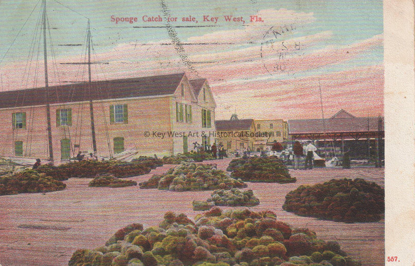 Postcard depicting sponges in piles along the Key West Bight awaiting an auction. The caption reads, ‘Sponge Catch for sale, Key West, Florida.’Subject Place