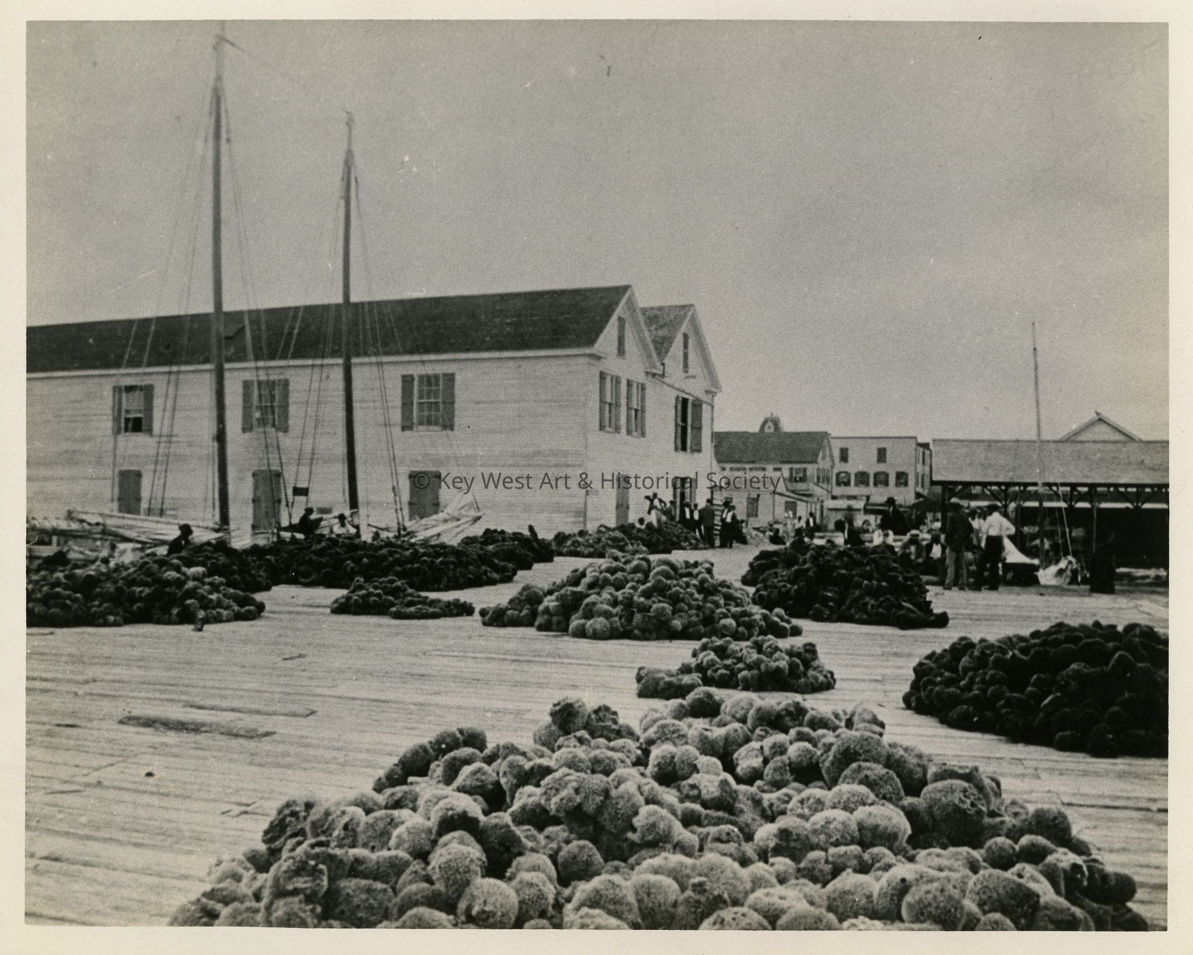 Black and white photograph of recently harvested sponges drying on Key West Bight docks near Elizabeth Street. Sponge warehouses in the background.
