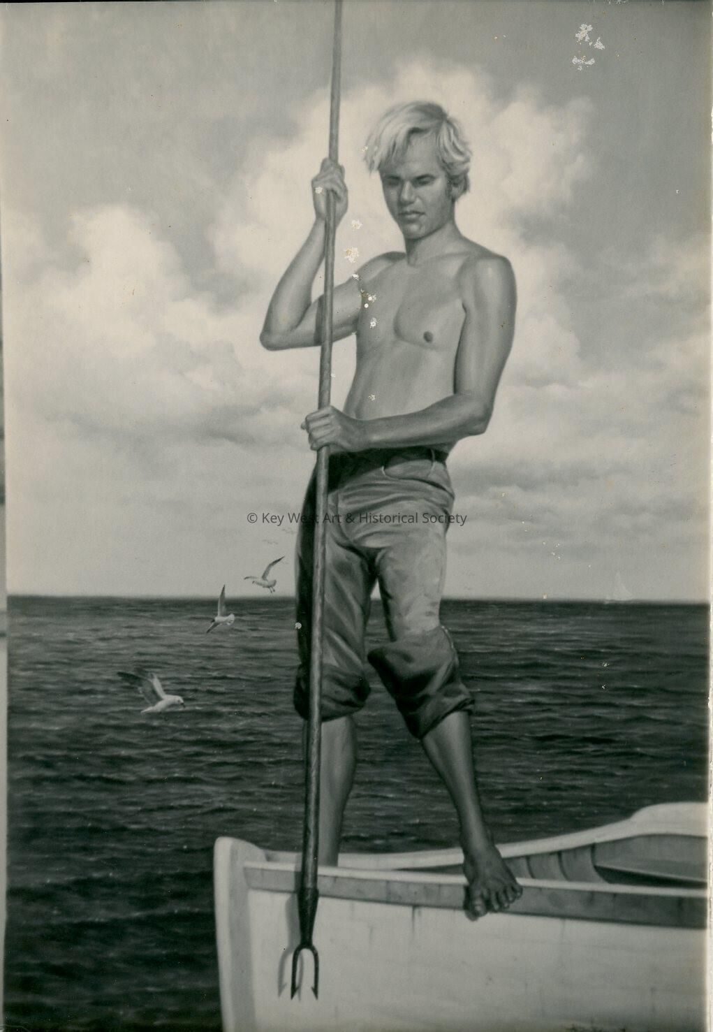 Black and white photograph of a painting, possibly by Alton Lowe, of a sponge fisherman holding his sponge hook.Photograph Details