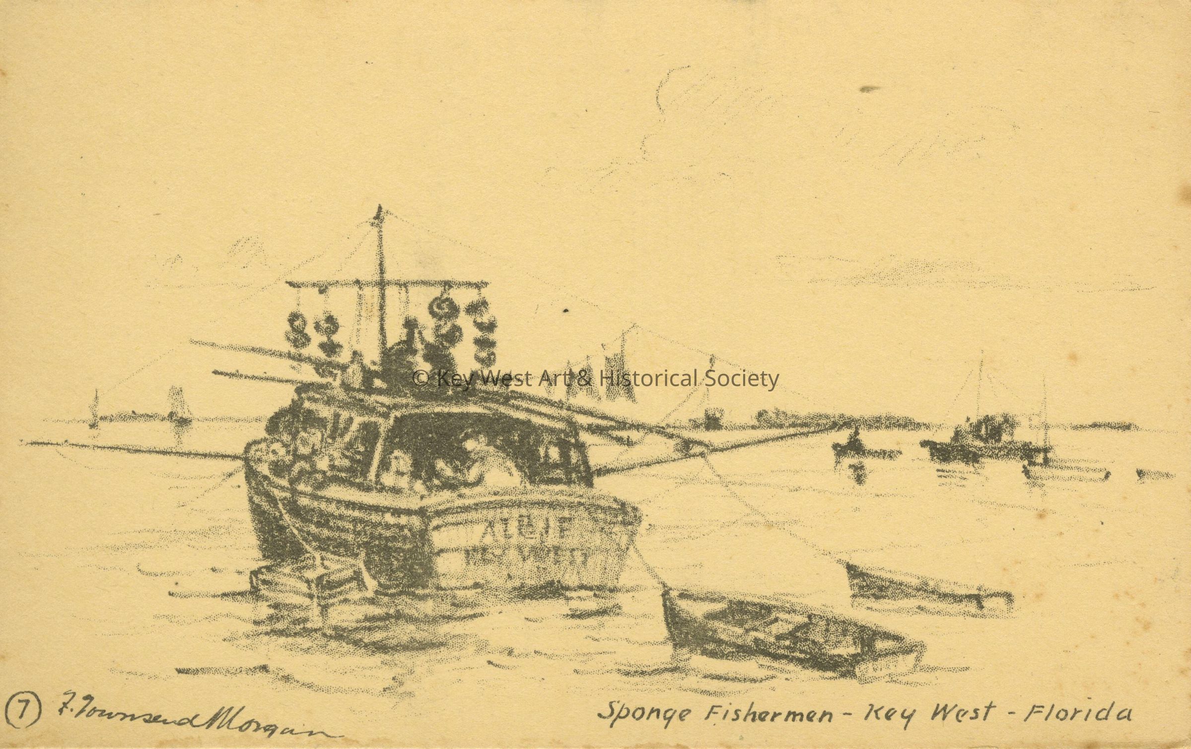 Postcard depicting sponge fishermen in Key West taken from a lithograph by Franklin Townsend Morgan. The caption reads, 'Sponge Fishermen - Key West, Florida’.Subject Place