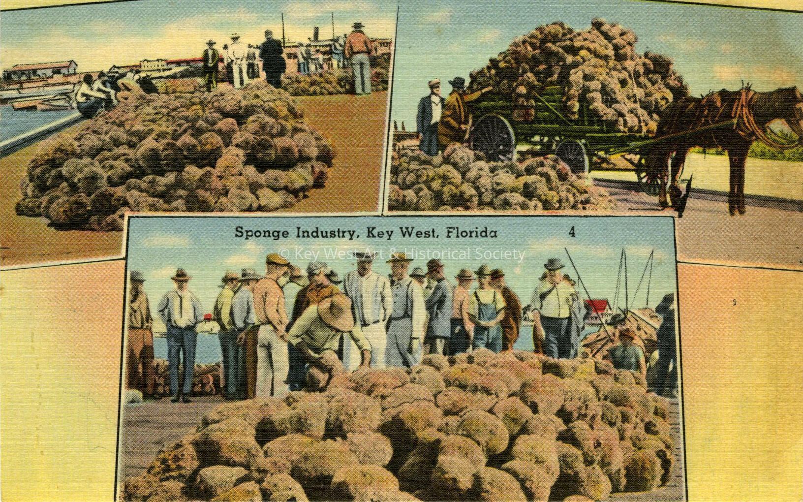 Linen postcard depicting three vignettes of the sponging industry. The caption reads, ‘Sponge Industry, Key West, Florida'. The description on the verso reads, 'In 1849 a small lot of sponge was sent to New York on a venture and narrowly escaped being thrown away, all of our sponge at that time coming from the Mediterranean. The business attained to an annual catch of $750,000.00, and the fact that the divers are not permitted in Monroe County waters, and the local method of taking sponge solely by means of long handled hooks has conserved the natural increase, and it is still an important source of income. Local water is so clear that spongers are able to see and hook sponges in 30 to 40 feet of water.Collection