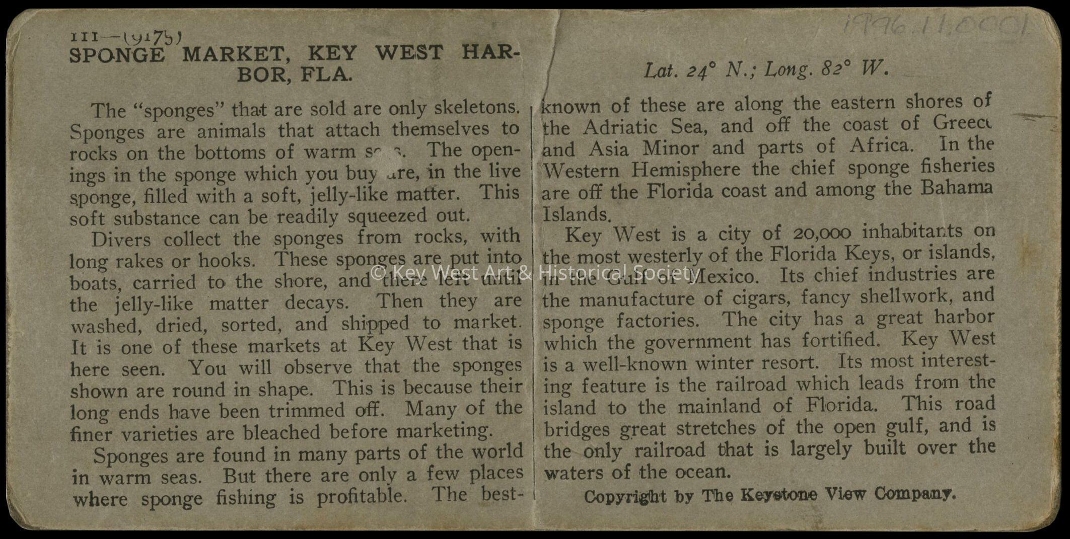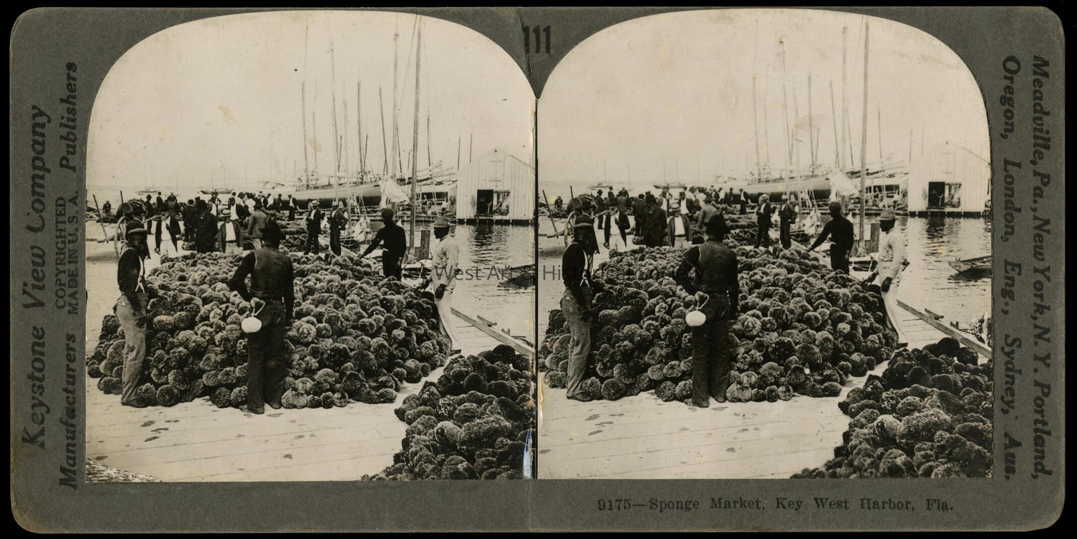 Black and white stereoview of men standing on the Key West Sponge Docks. Extensive text on verso.