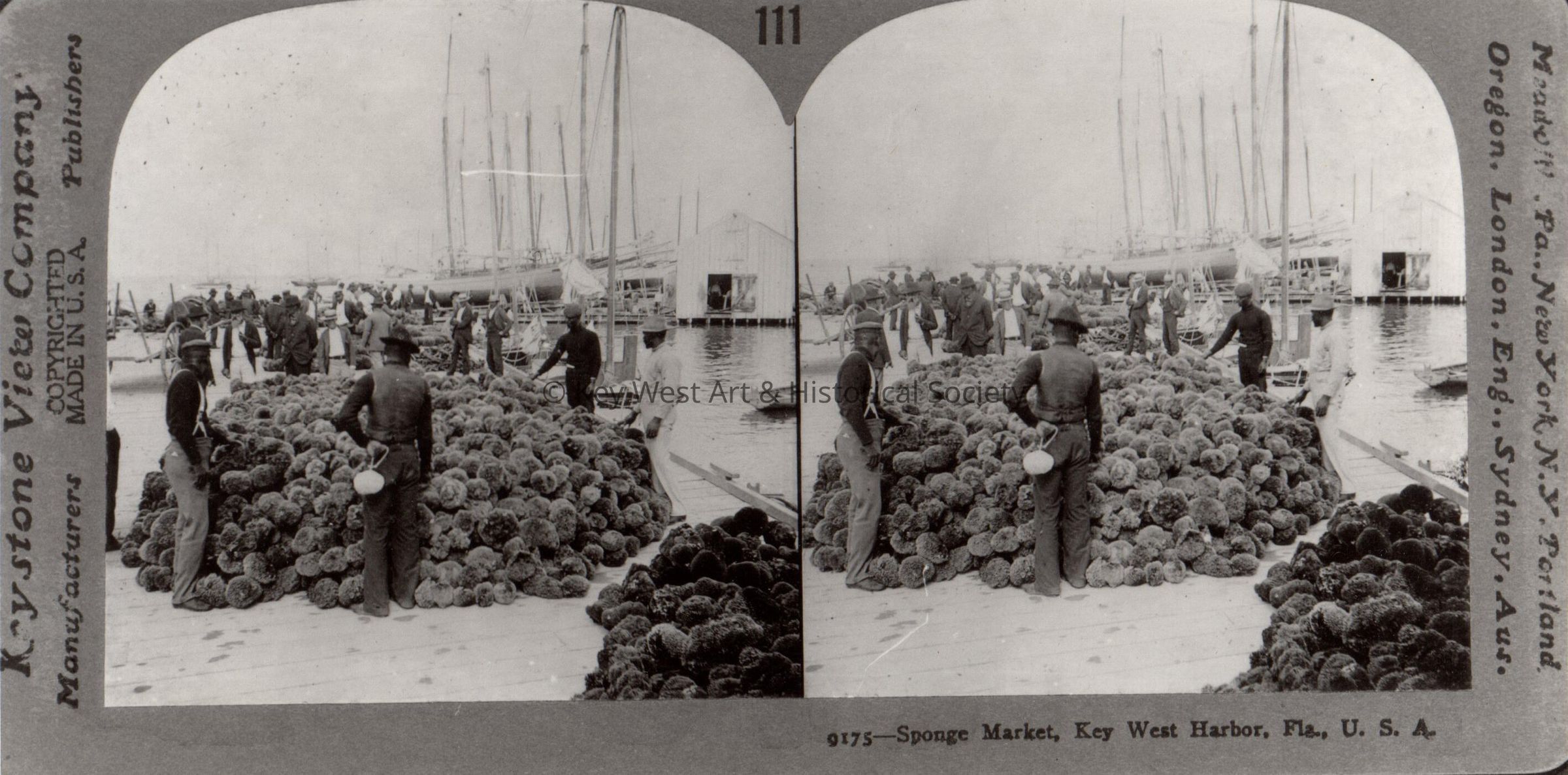Black and white stereograph depicting piles of sponges on the dock at Key West Bight. Caption reads, 'Sponge Market, Key West Harbor, Fla. U.S.A.'Photograph Details