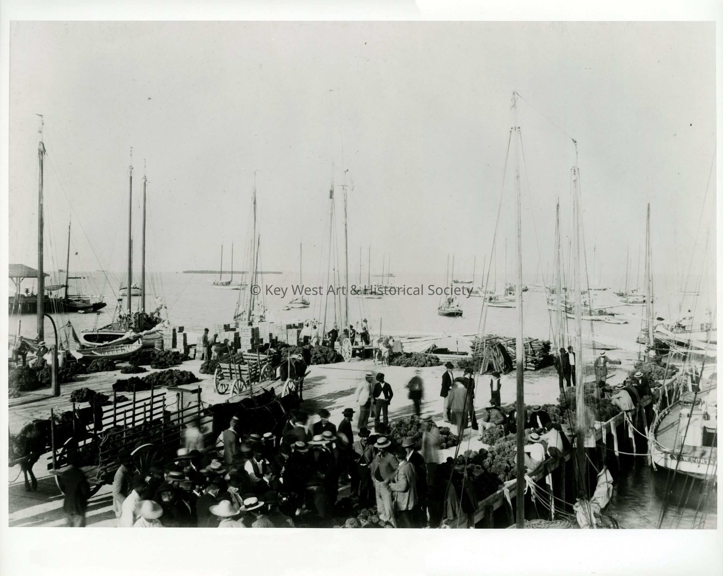 Black and white photograph of a sponge sale on the dock in Key West Bight at the foot of Elizabeth Street. The schooner NEWPORT is docked at the pier.