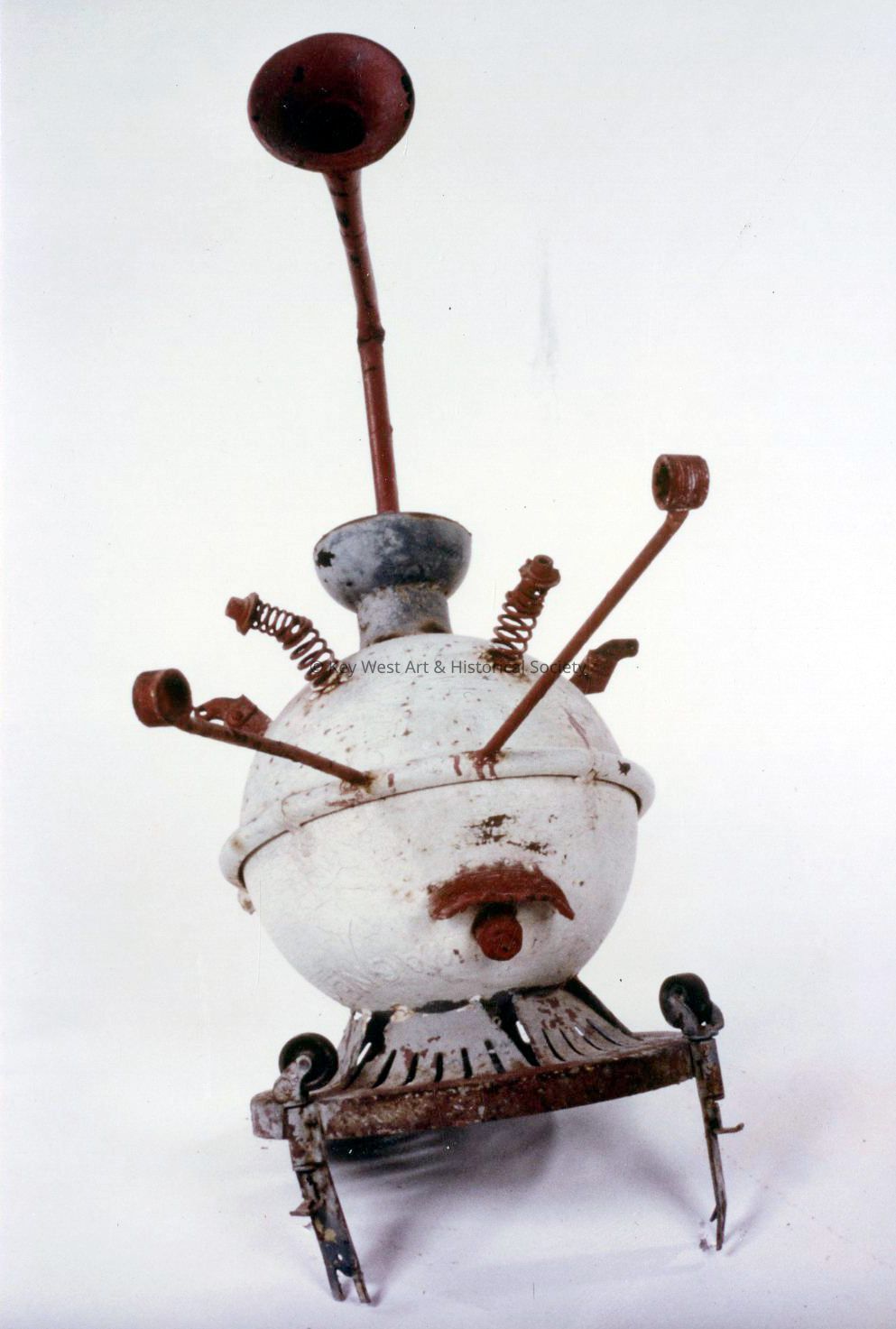 Freestanding sculpture by Stanley Papio depicting a fanciful head, suggesting a space creature. The sculpture is composed of a sphere mounted on a circular base, with inverted wheel casters for arms. Eyes are on springs that vibrate. A hat consists of bent horn is mounted on top of the head.Type of Sculpture