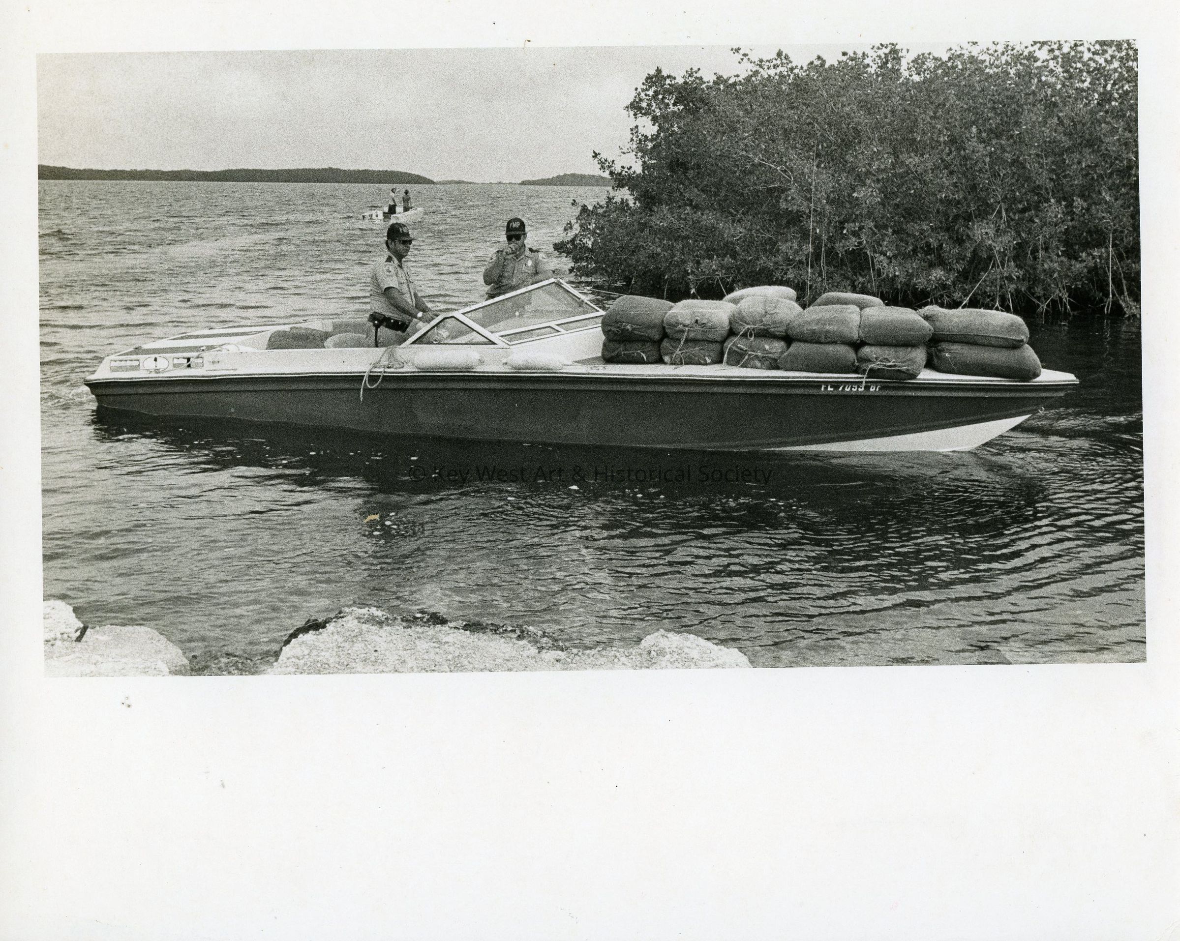 Black and white photograph of law enforcement drug confiscation off the coast of the Keys.